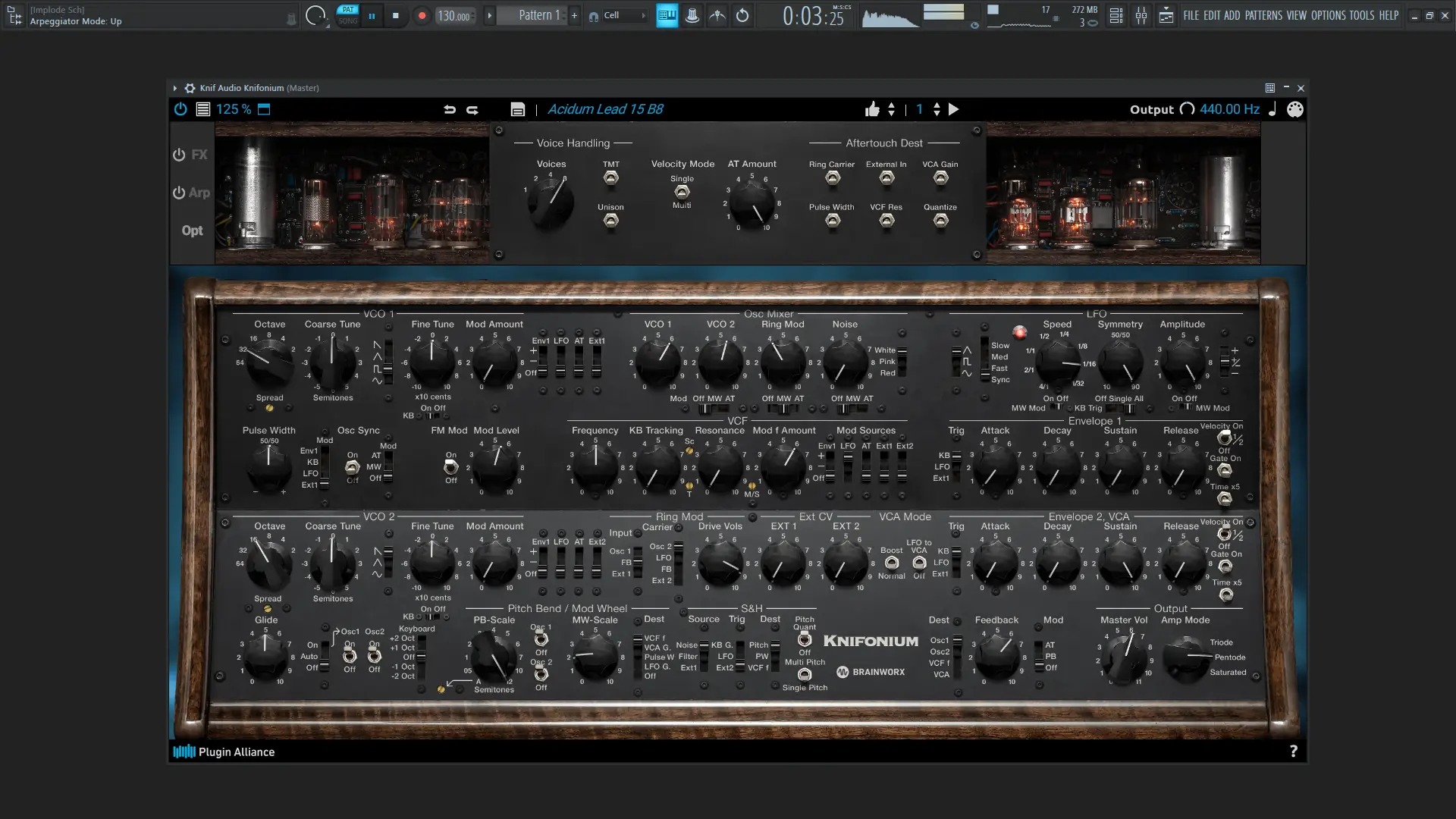 Интерфейс Knifonium сочетает в себе винтажный дизайн и современные элементы управления. После загрузки плагина пользователь получает доступ к двум ламповым генераторам, кольцевому модулятору и фильтру 4-го порядка с лестничной характеристикой. Управление модуляцией осуществляется через LFO и огибающие, параметры которых подвержены естественным колебаниям благодаря технологии TMT. Можно активировать унисон-режим для уплотнения звука или использовать mid-side обработку для расширения стереоизображения. Эффекты включают винтажный фейзер, шейпер формы сигнала и эквалайзер SPL EQ Ranger, что позволяет обрабатывать звук без подключения внешних процессоров. Арпеджиатор поддерживает различные режимы воспроизведения и синхронизацию с темпом проекта, а пресеты легко просматривать и применять через встроенную библиотеку.