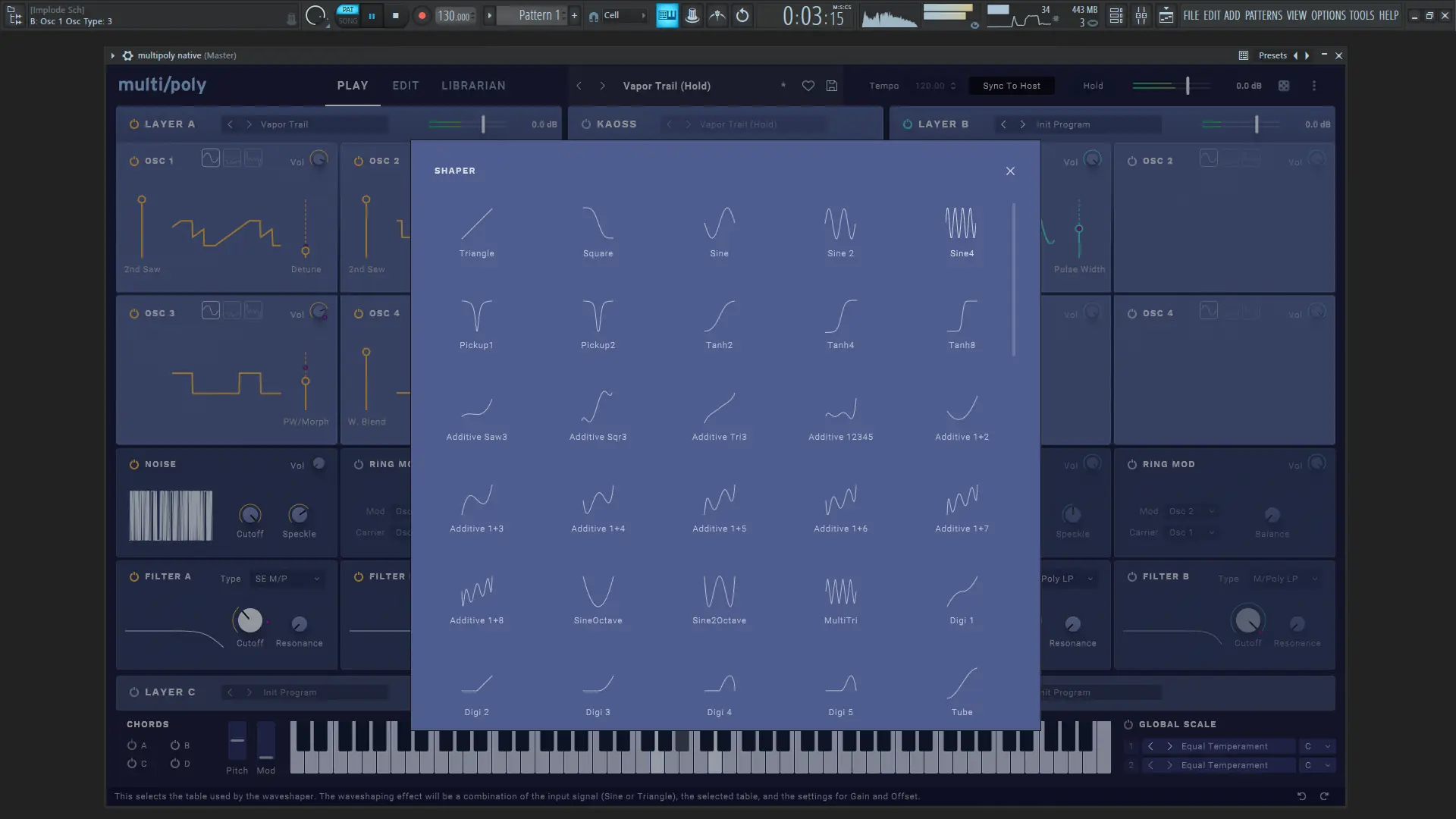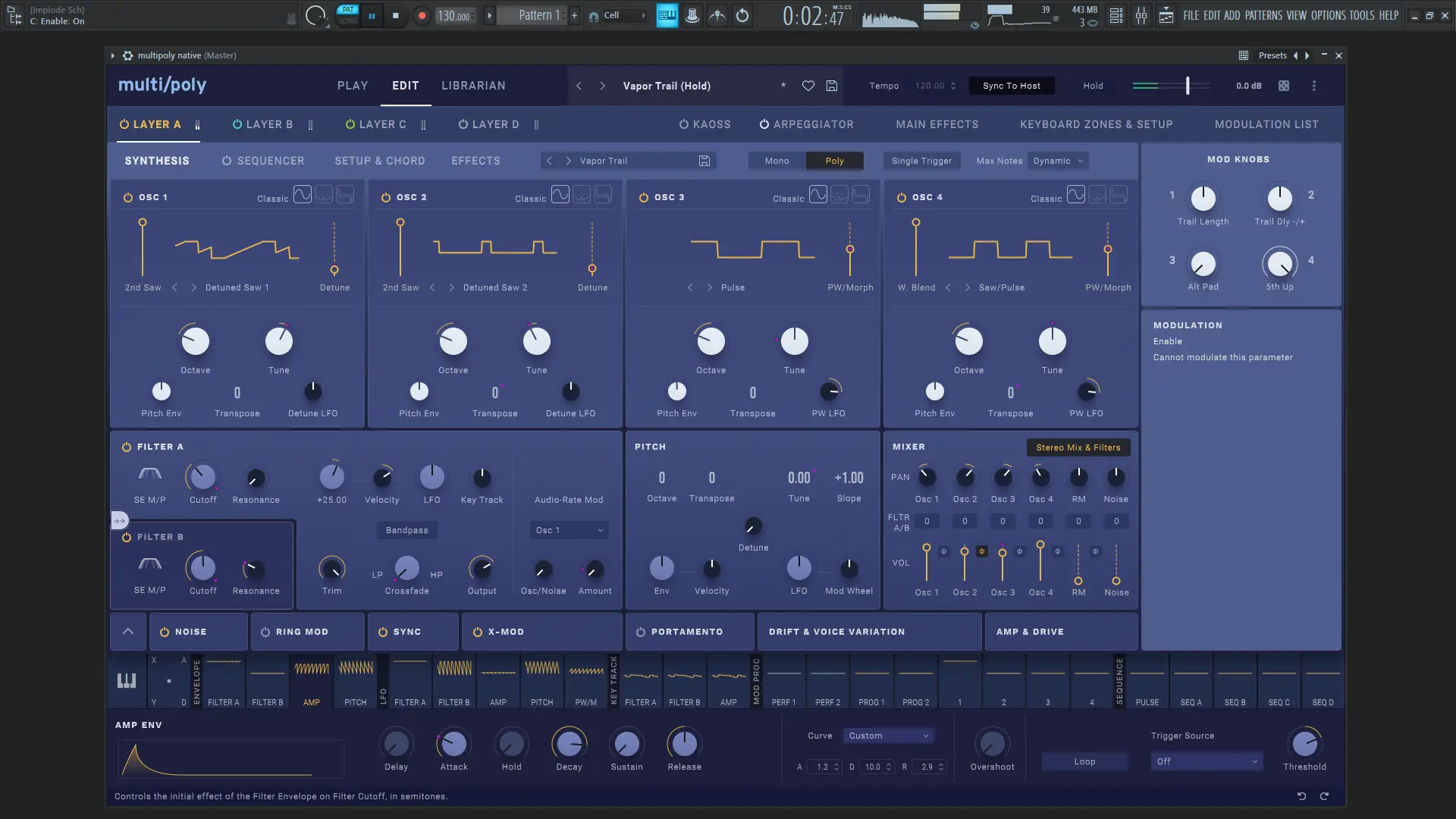 - Осцилляторы сохраняют фазу и высоту тона, имитируя дрейф, присущий аналоговым синтезаторам.