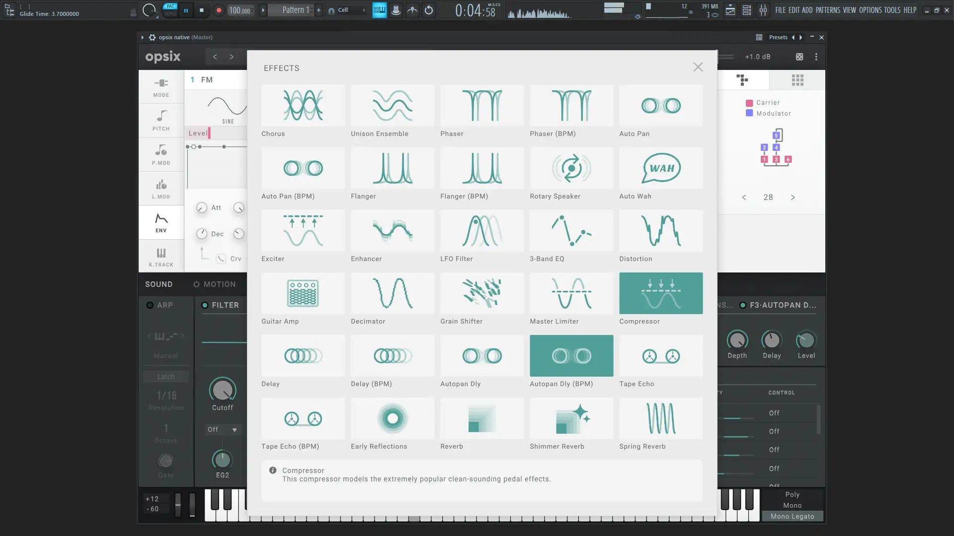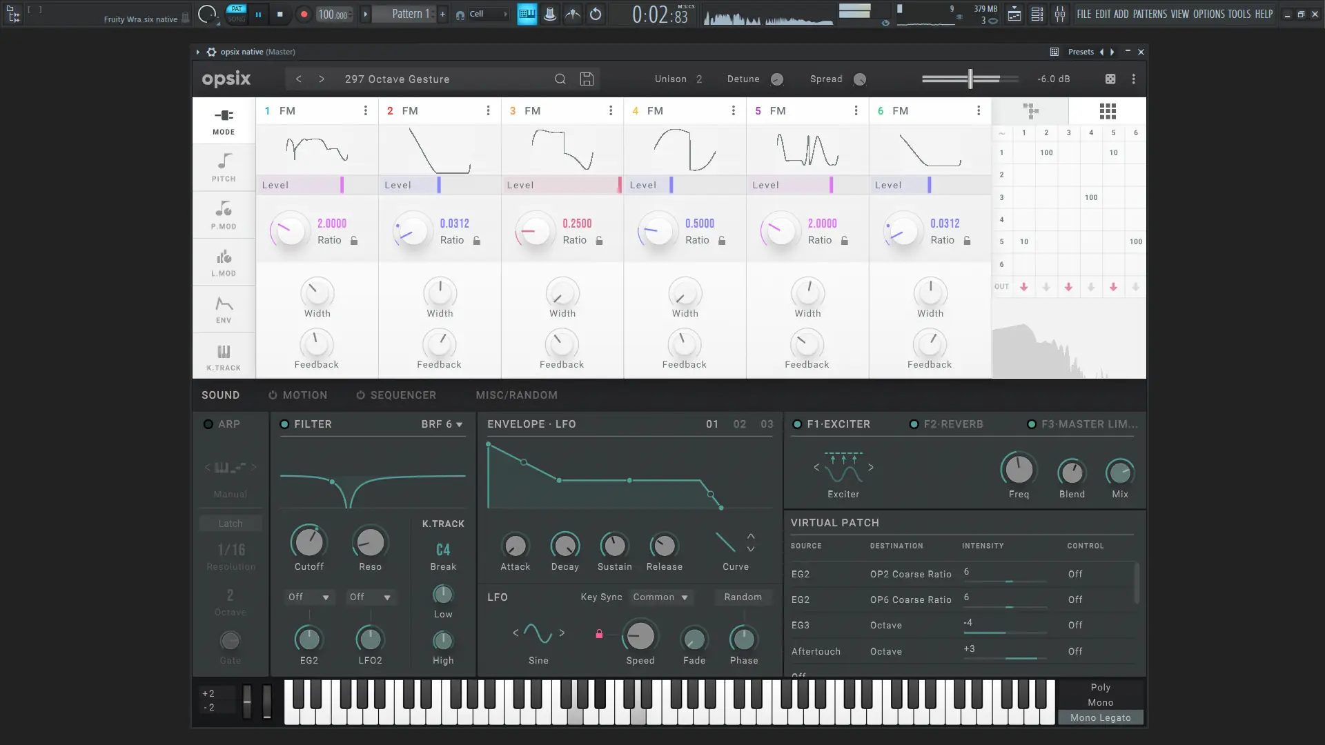 Работа с программой начинается с выбора алгоритма — базовой схемы соединения операторов, определяющей путь сигнала. Далее можно настраивать форму волны каждого оператора, регулировать уровни, параметры огибающих и фильтров. Секция MOD позволяет подключать LFO и огибающие к любым параметрам через систему виртуальных кабелей. Пошаговый секвенсор активируется одной кнопкой и позволяет записывать не только ноты, но и изменения параметров в реальном времени. Благодаря визуальной обратной связи пользователь легко отслеживает, как изменяется звук на каждом этапе.