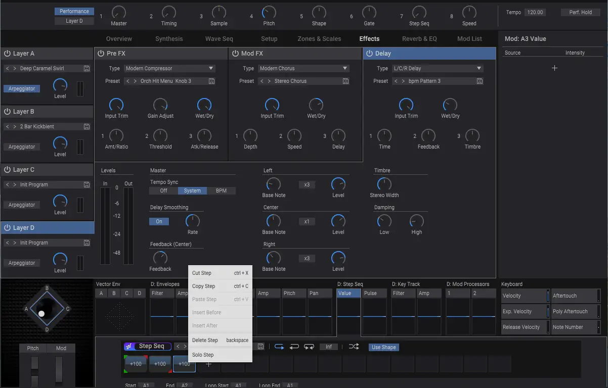 Работа с синтезатором начинается с загрузки плагина в DAW, после чего открывается полноценный интерфейс, идентичный аппаратной версии. Пользователь может создавать сложные волны, управляя таймингом, питчем и амплитудой на уровне отдельных шагов последовательности. Каждый из четырёх слоёв можно модулировать независимо, используя векторное управление или MIDI-контроллеры для динамических переходов. Рандомизация настроек помогает быстро генерировать новые идеи, а 14 встроенных эффектов позволяют обрабатывать звук без подключения внешних процессоров. Благодаря высокой оптимизации движка, модуляция работает с 4000 приёмниками без просадок производительности.