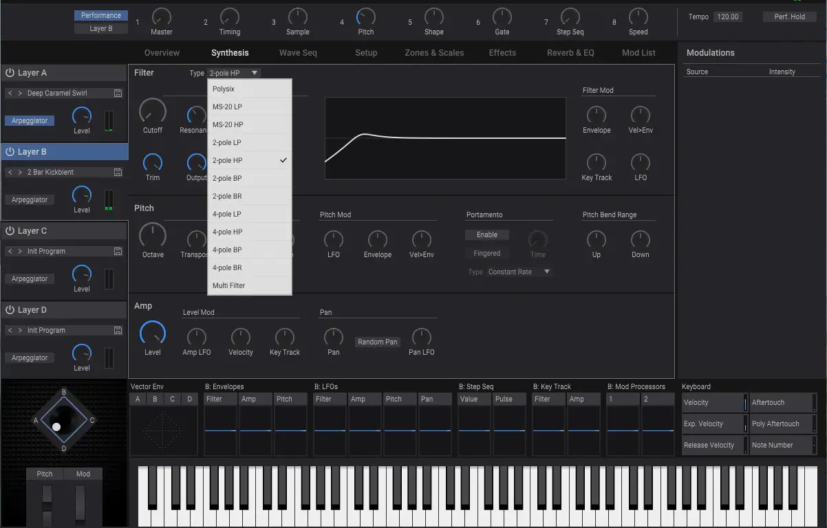 - Четыре независимых слоя со встроенным векторным управлением для плавного переключения между звуками