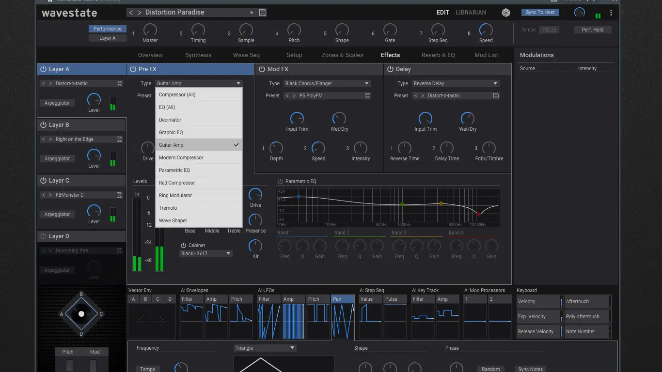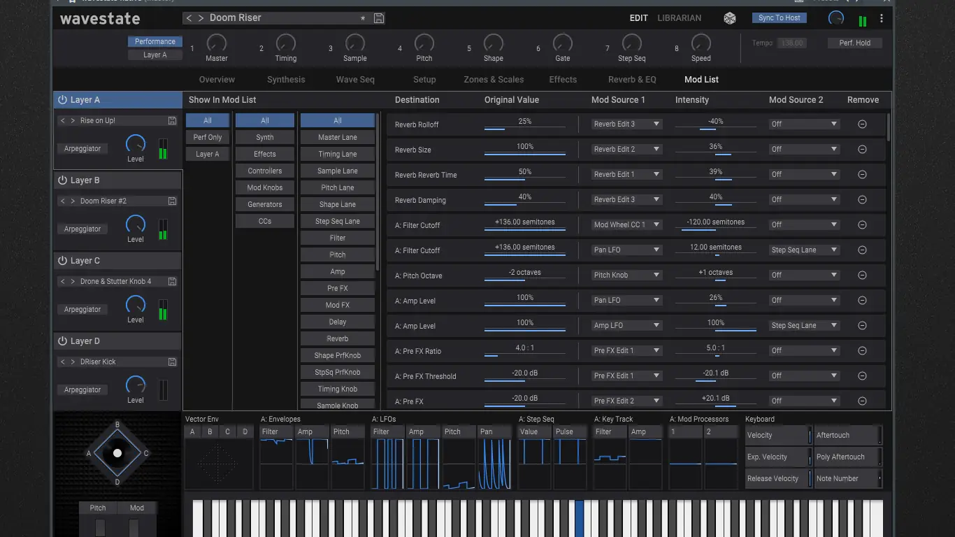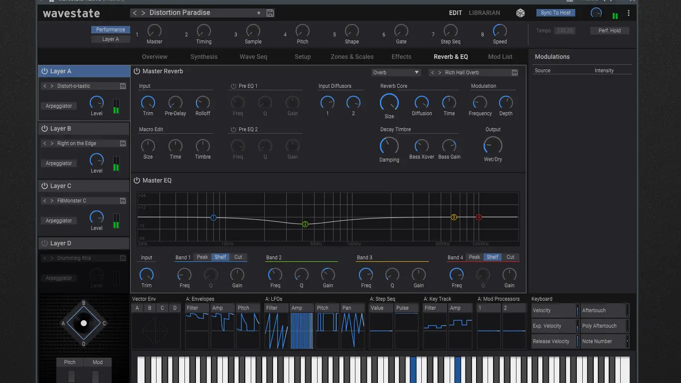 Пользовательский интерфейс KORG Wavestate Native максимально приближён к аппаратной версии, что упрощает переход между платформами. Каждый из четырёх слоёв поддерживает векторное управление, позволяя плавно переключаться между звуками в реальном времени. Тайминг, поведение волн и питч настраиваются независимо, открывая широкие возможности для создания динамичных и изменяющихся во времени текстур. Модульная система включает до 4000 приёмников модуляции, работающих без потери производительности. Рандомизатор предлагает множество параметров для генерации непредсказуемых, но музыкально уместных звуковых изменений. Обработка сигнала включает 14 одновременно действующих эффектов, охватывающих реверберацию, задержку, модуляцию и фильтрацию. Благодаря интеграции с DAW, пользователь может сохранять и вызывать Set Lists с плавными переходами между звуками, что особенно полезно в живых выступлениях и студийной работе.