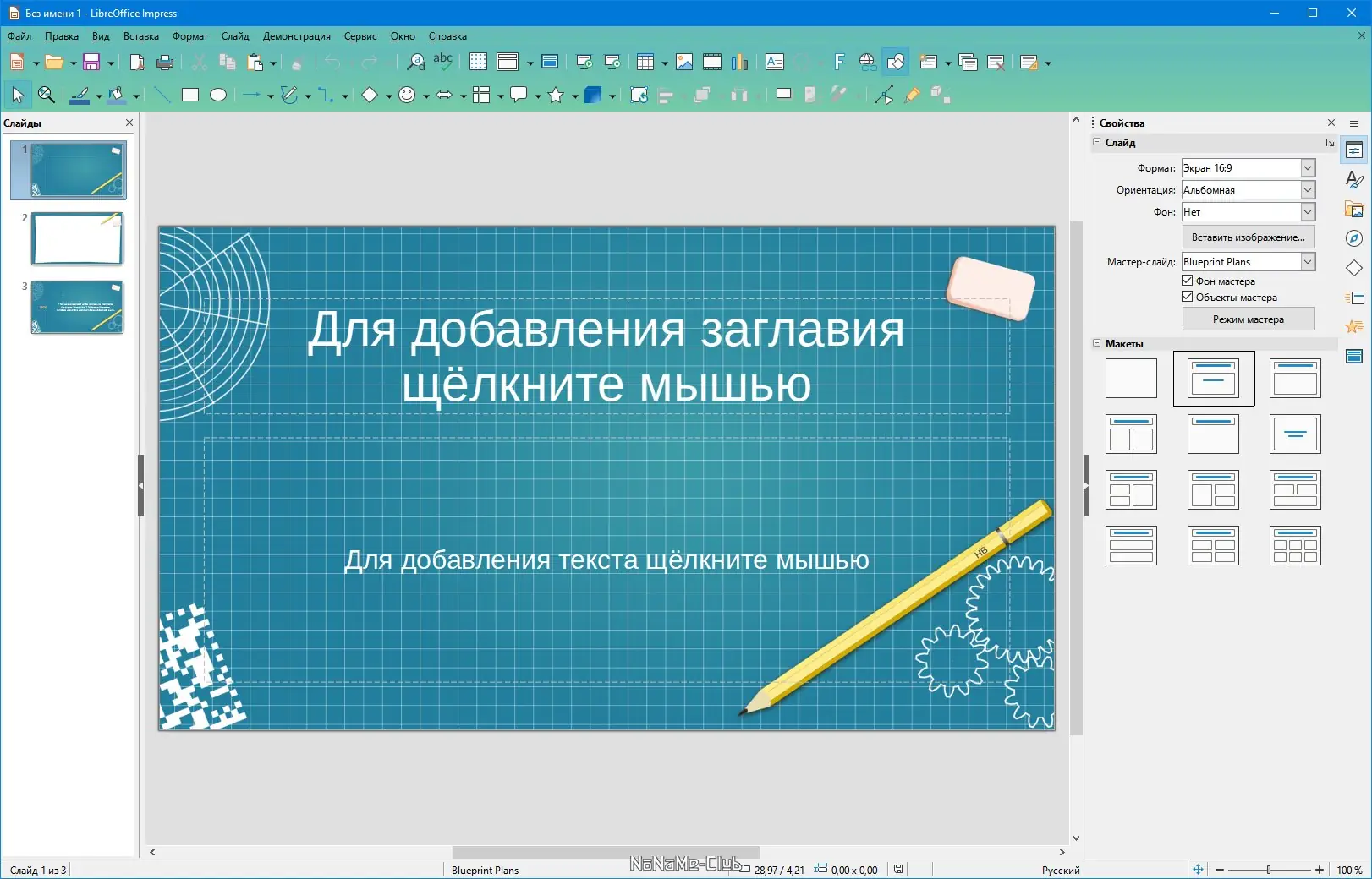 - Impress используется для подготовки динамичных презентаций с анимацией, переходами и мультимедийными вставками.