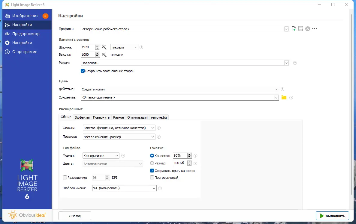 - Настройка разрешения, качества сжатия и пропорций изображений