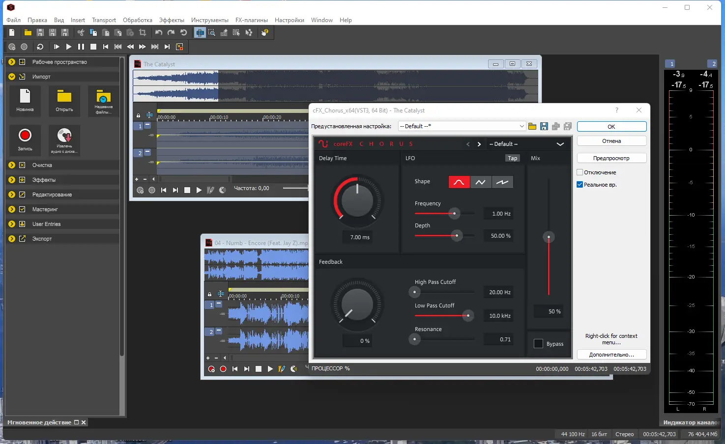 - Широкий набор встроенных эффектов и поддержка сторонних плагинов VST.