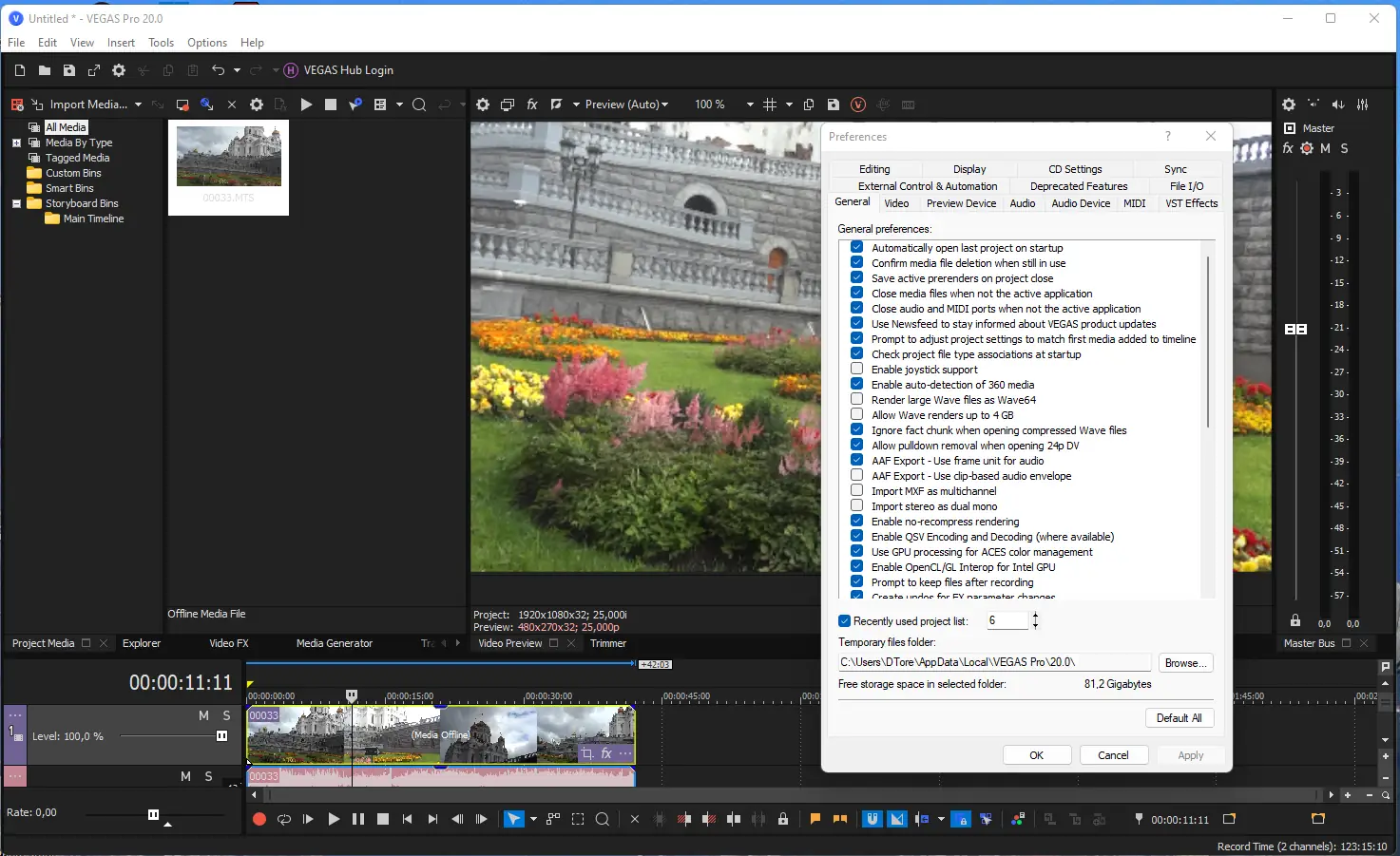 MAGIX Vegas Pro демонстрирует высокую производительность при работе с тяжёлыми проектами благодаря поддержке GPU-ускорения и прокси-режиму. Цветокоррекция реализована на профессиональном уровне: доступны цветовые кривые RGB, коррекция белых и чёрных точек, а также профессиональные прицелы для видео HDR. Система маскирования Mocha с планарным отслеживанием, удостоенная премии Оскар, позволяет точно выделять движущиеся объекты. Присутствует поддержка 360-градусного видео с настройкой панорамирования, наклона и коррекцией объектива. Благодаря архитектуре OpenFX, пользователи могут подключать сторонние плагины для расширения функционала.
