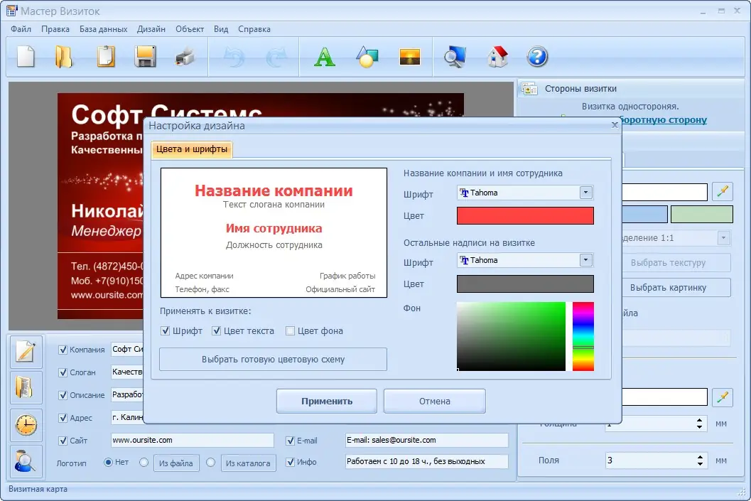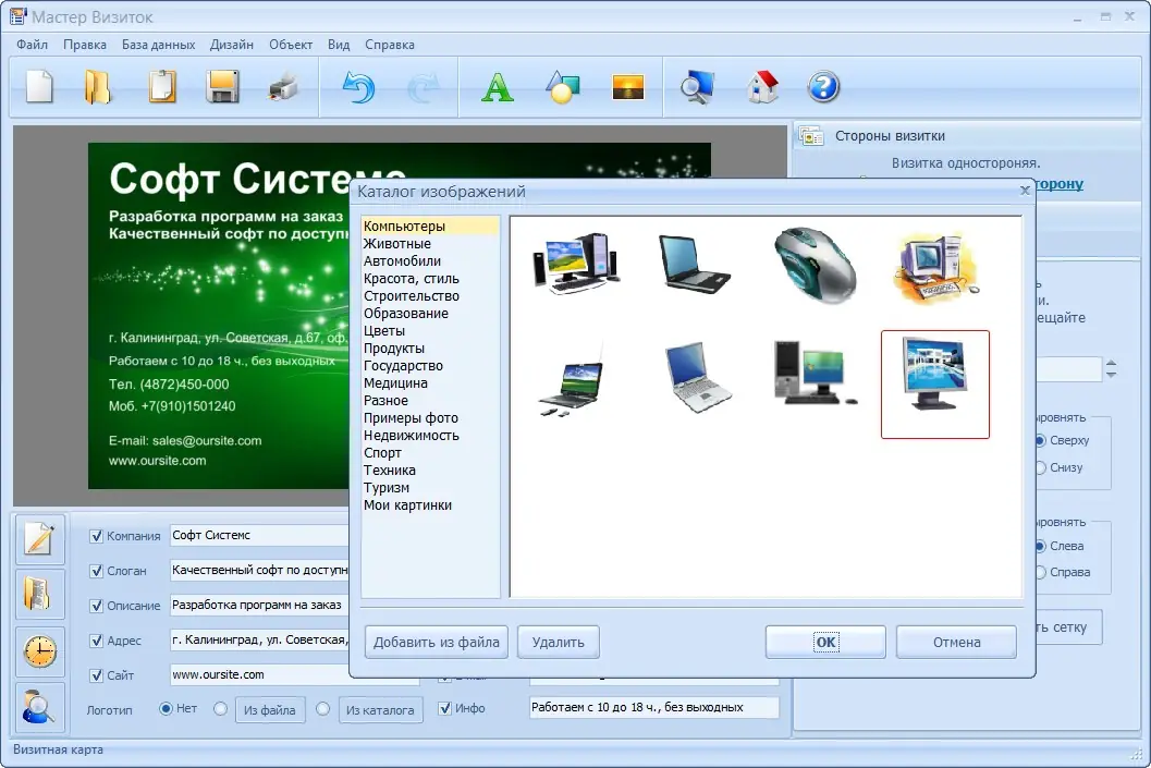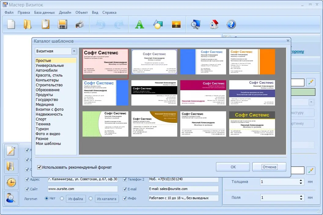 Мастер Визиток — это специализированный редактор для создания визиток и бейджей с удобным интерфейсом и богатой библиотекой дизайнерских решений. Программа предлагает более 150 шаблонов для визиток на разные темы, включая современные стили с фотографиями и логотипами. Пользователь может как выбрать готовый макет, так и разработать уникальный дизайн с нуля, используя встроенные инструменты редактирования.