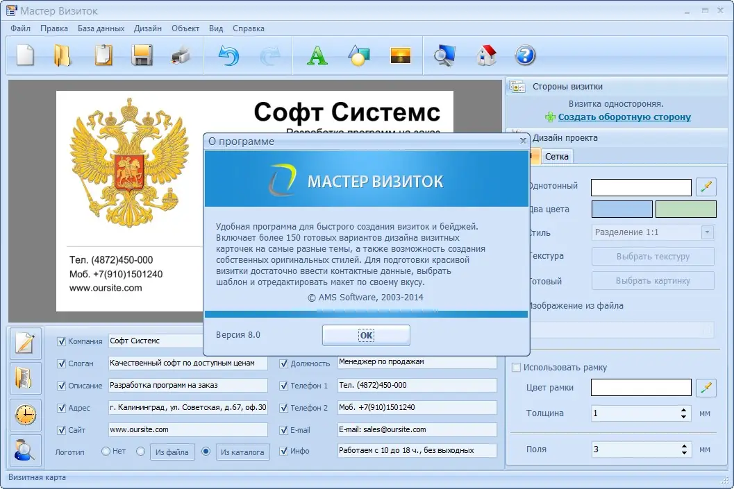 Мастер Визиток разработан компанией AMS Software как решение для быстрого и качественного оформления деловой документации. Программа поддерживает создание визитных карточек, контактных и корпоративных карт, а также бейджей различного назначения. Каждый тип документа адаптирован под свои задачи — от личного брендинга до корпоративного позиционирования.