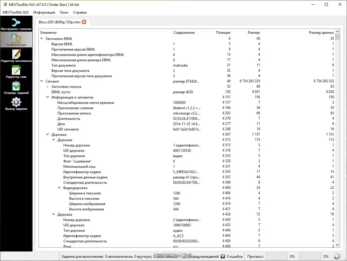 MKVToolNix — это мощный и удобный набор инструментов для создания, редактирования и управления файлами в формате MKV. Программа позволяет объединять, разделять, редактировать видео, добавлять или удалять аудиодорожки и субтитры, а также настраивать метаданные. Поддержка множества форматов и интуитивный интерфейс делают её незаменимым решением для работы с мультимедиа.