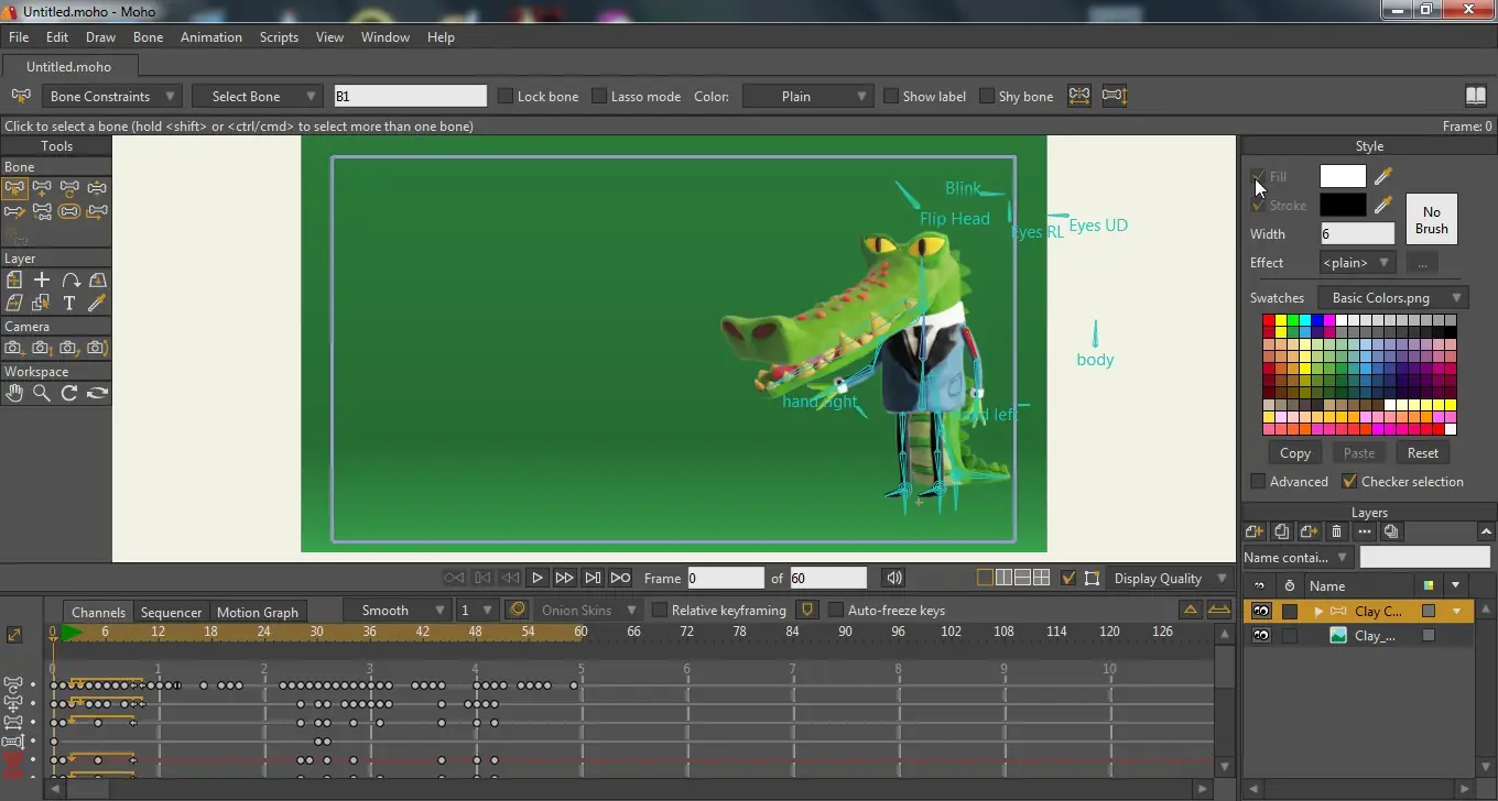 Работа с Moho начинается с создания нового проекта, где можно импортировать графические ресурсы, включая векторные объекты, изображения и аудиодорожки. Основной рабочий процесс строится вокруг временной шкалы, где расставляются ключевые кадры и настраиваются анимационные кривые. Инструмент Smart Warp позволяет деформировать объекты с помощью пользовательских сеток, а Pin Bones даёт точечный контроль над элементами. Пользователи могут одновременно анимировать несколько слоёв, что значительно ускоряет процесс. Встроенные функции, такие как предварительный просмотр анимации и автоматическое обновление внешних медиафайлов, упрощают тестирование и доработку сцен. Работа с костями и слоями поддерживает вложенность и гибкое управление, включая Flexi-Binding для изоляции воздействия скелета.
