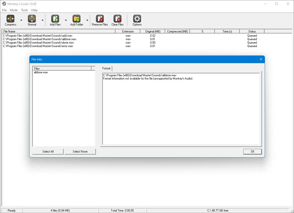 - Возможность декомпрессии файлов обратно в WAV и другие форматы.
