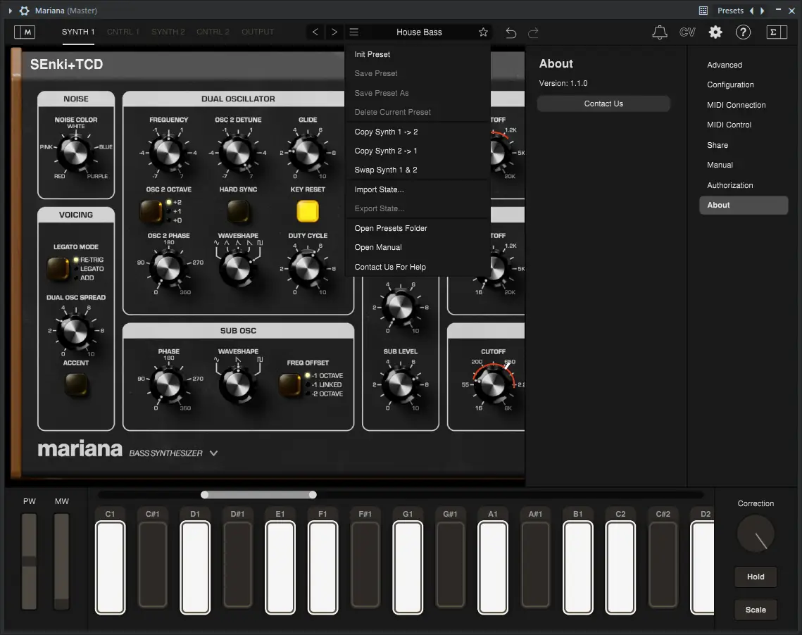 Для начала работы с Mariana достаточно загрузить плагин в вашу DAW или запустить приложение автономно. Настройка звука начинается с выбора пресета или инициализации нового патча. Каждый из двух слоёв можно настраивать отдельно: подбирать форму волны, применять фильтрацию, задавать маршруты модуляции через матрицу. Работа с эффектами осуществляется встроенно — компрессия и насыщение доступны без подключения внешних процессоров. Настройки фильтров, включая наклон 6, 12, 18 и 24 дБ, позволяют точно контролировать частотный спад. Управление через MIDI-контроллер упрощает живое исполнение, а версия для iPad даёт доступ к сенсорной клавиатуре с векторным управлением.