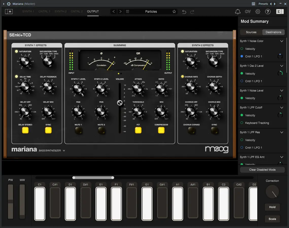 Mariana представляет собой двухслойный синтезатор, каждый уровень которого включает по два генератора с возможностью точной настройки формы волны, расстройки и стереорасположения. Саб-осциллятор усиливает нижний регистр, добавляя ощущение массы и плотности звуку. Два резонансных фильтра Moog, известные своей тёплой и насыщенной характеристикой, работают в паре с третьим фильтром, выделенным исключительно для субсигнала, что позволяет детально формировать тембр. Кроссовер-фильтры и стереогенераторы обеспечивают чёткое разделение частотных диапазонов и предотвращают фазовые конфликты при микшировании.