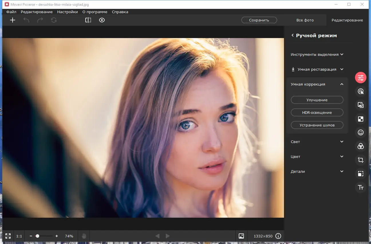 Movavi Picverse представляет собой многофункциональный графический редактор, ориентированный на упрощение процесса обработки фотографий. Программа использует технологии нейросетей для автоматического анализа и улучшения снимков, что позволяет добиваться высокого качества без глубоких знаний в области цифровой обработки. Она поддерживает широкий спектр форматов, включая RAW, и предлагает инструменты как для базовой коррекции, так и для сложных манипуляций с изображением.