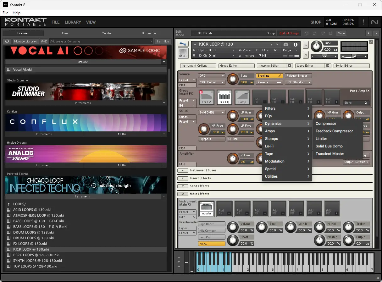 Работа с Kontakt начинается с загрузки инструмента через встроенный браузер, который позволяет фильтровать контент по жанру, бренду или типу звука. После загрузки доступна настройка параметров звука: применение эффектов, изменение огибающих, настройка LFO и матрицы модуляции. Для создания собственных инструментов используется Kontakt Script Processor, позволяющий программировать поведение сэмплов с помощью скриптов.