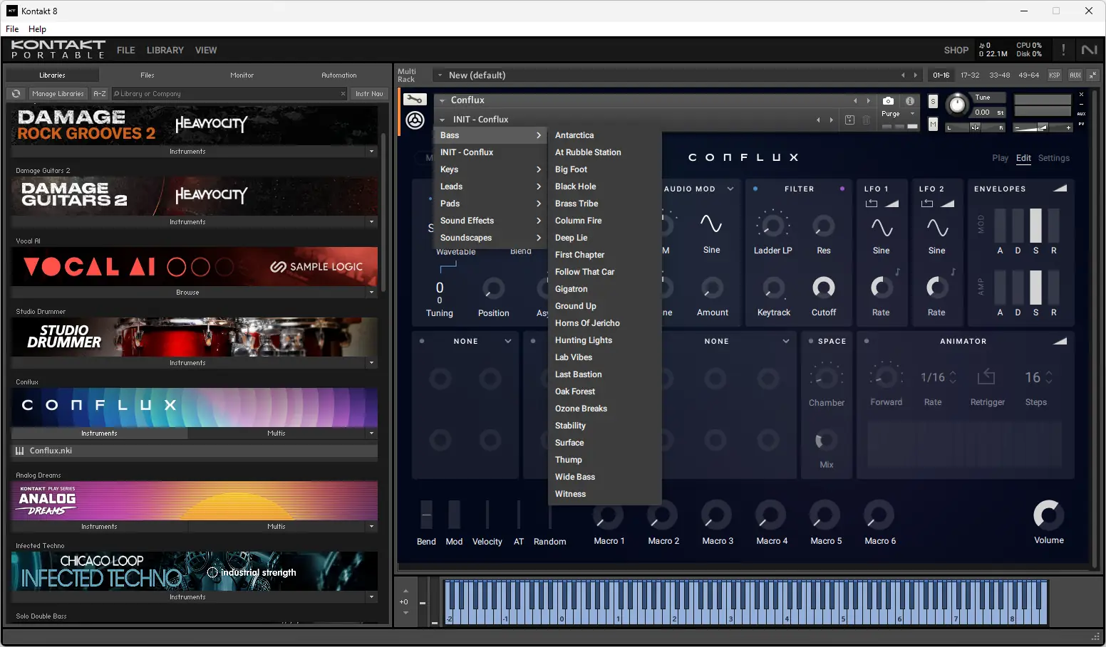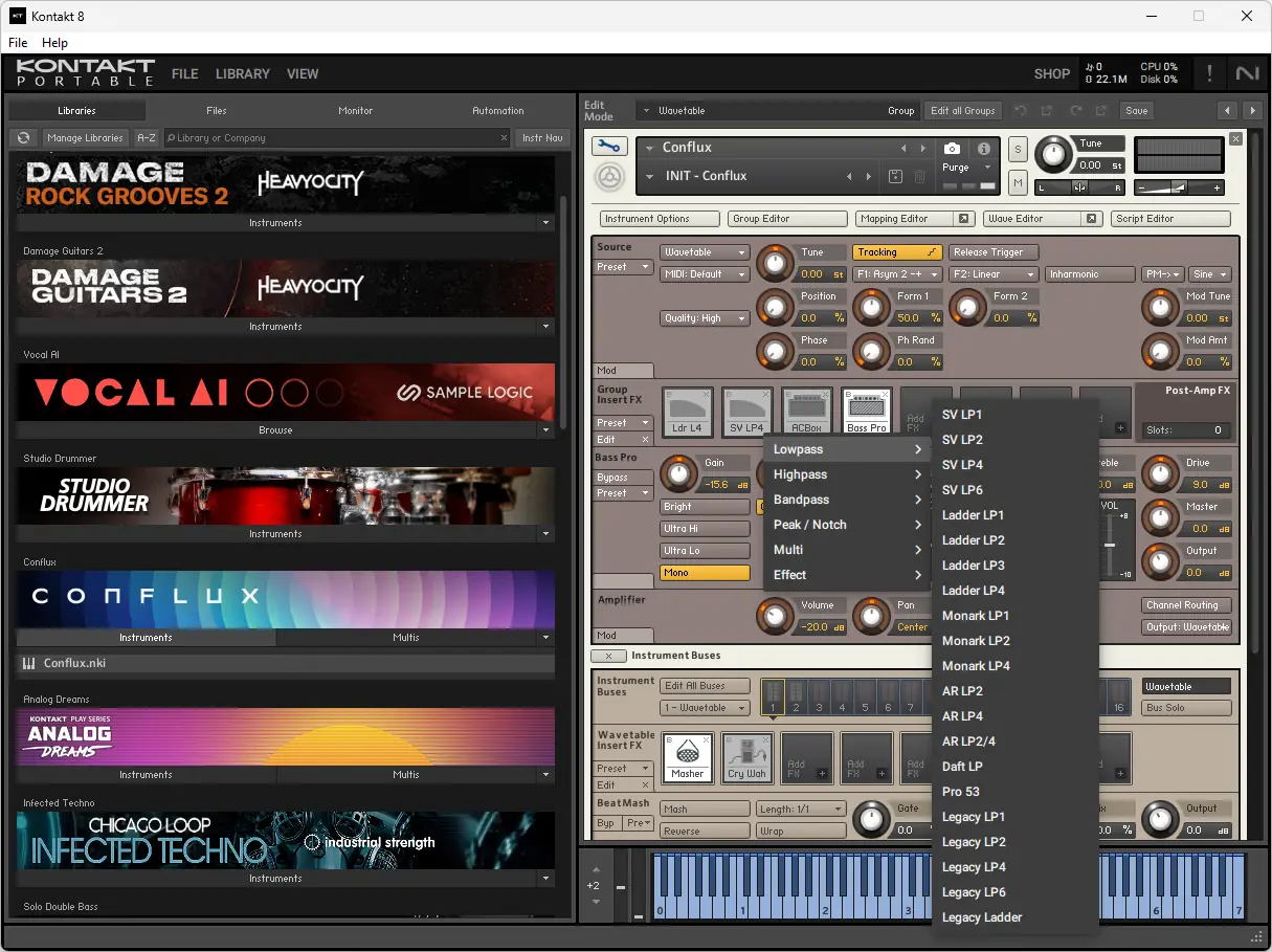 Работа с kontakt начинается с загрузки инструмента в цифровой аудиоредактор или запуска в standalone-режиме. Пользователь может выбирать из установленных библиотек, просматривая их через обновлённый браузер, который фильтрует содержимое по жанрам, типам звуков или производителям. Для создания собственных инструментов доступен режим разработки, где можно настраивать зоны сэмплирования, параметры огибающих, применять LFO и фильтры. Новые функции, такие как Chords и Phrases, позволяют генерировать мелодические последовательности, используя как MIDI-ввод, так и случайные алгоритмы. Инструмент Conflux объединяет сэмплирование и синтез, обеспечивая глубокое взаимодействие между звуковыми слоями.