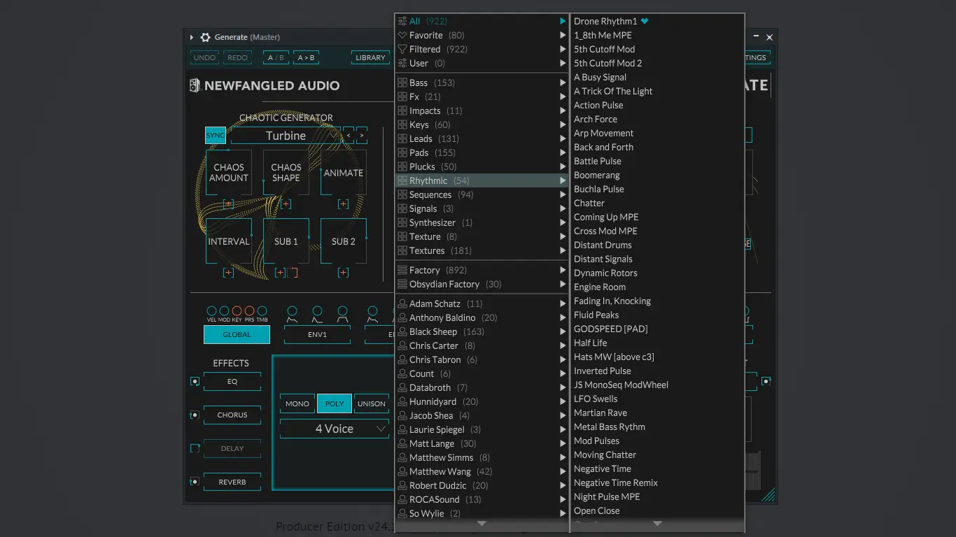 Generate от Newfangled Audio — это виртуальный синтезатор, разработанный для тех, кто стремится выйти за рамки традиционного звукосynthesisа. Он объединяет элементы модульного синтеза с современными технологиями, предлагая пять уникальных хаотических осцилляторов, каждый из которых работает по сложным алгоритмам. Программа ориентирована на создание динамичных, непредсказуемых звуков, которые можно тонко настроить с помощью широкой системы модуляции.
