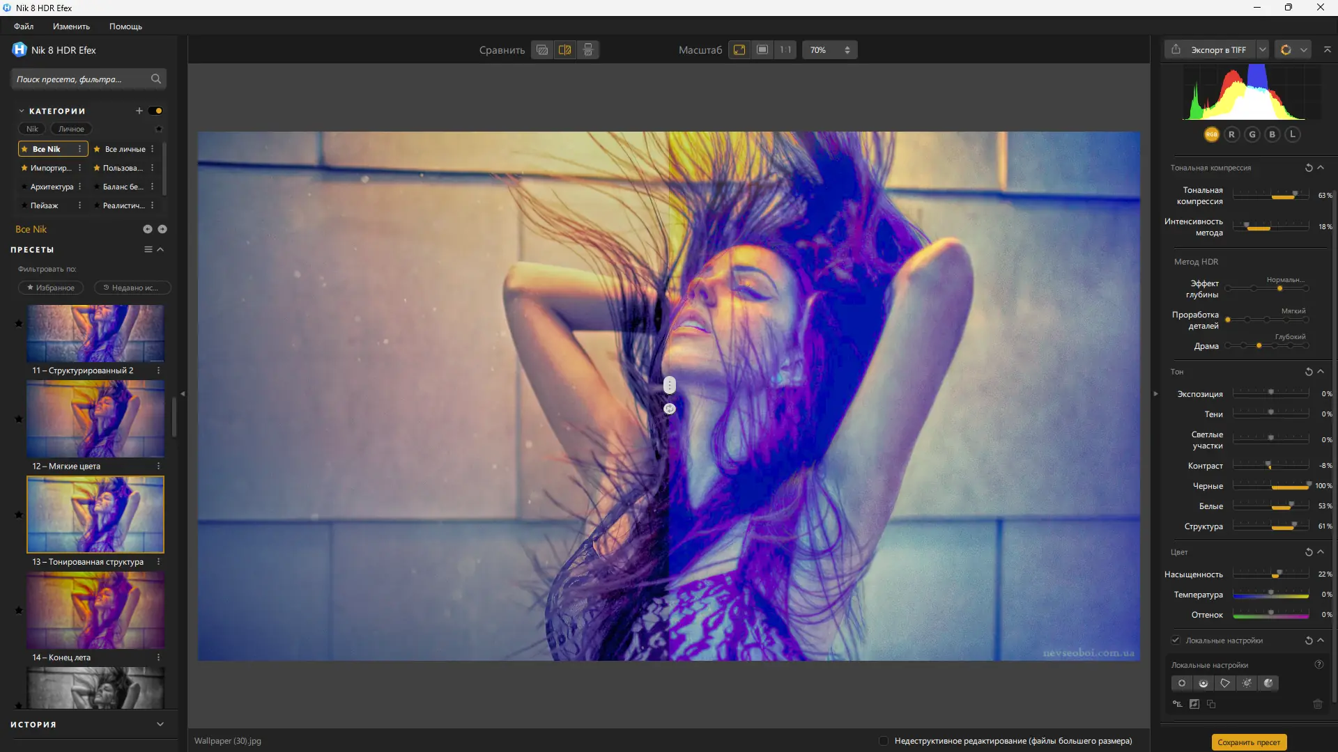 - Каждый модуль ориентирован на конкретный аспект редактирования: Nik Dfine устраняет шум, Nik Sharpener отвечает за резкость, Nik HDR Efex склеивает экспозиции.