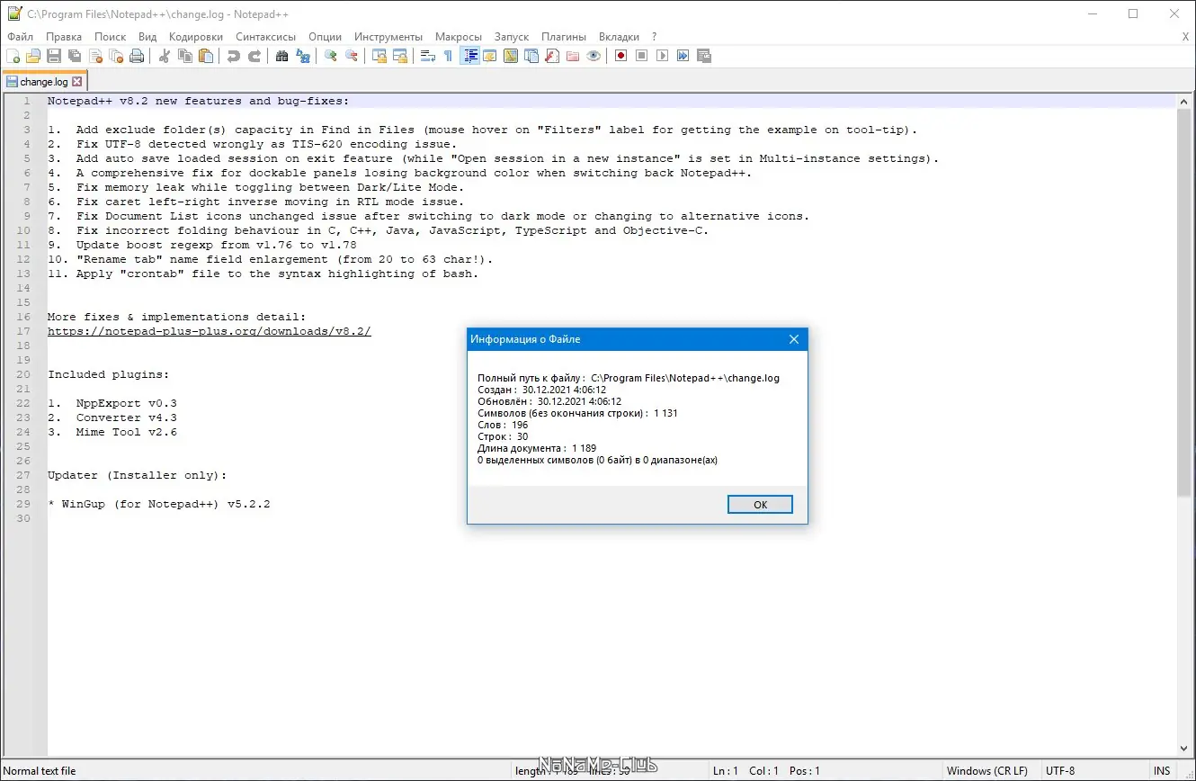Notepad++ автоматически определяет кодировку файла и его изменения на диске, предотвращая потерю данных при внешнем редактировании.