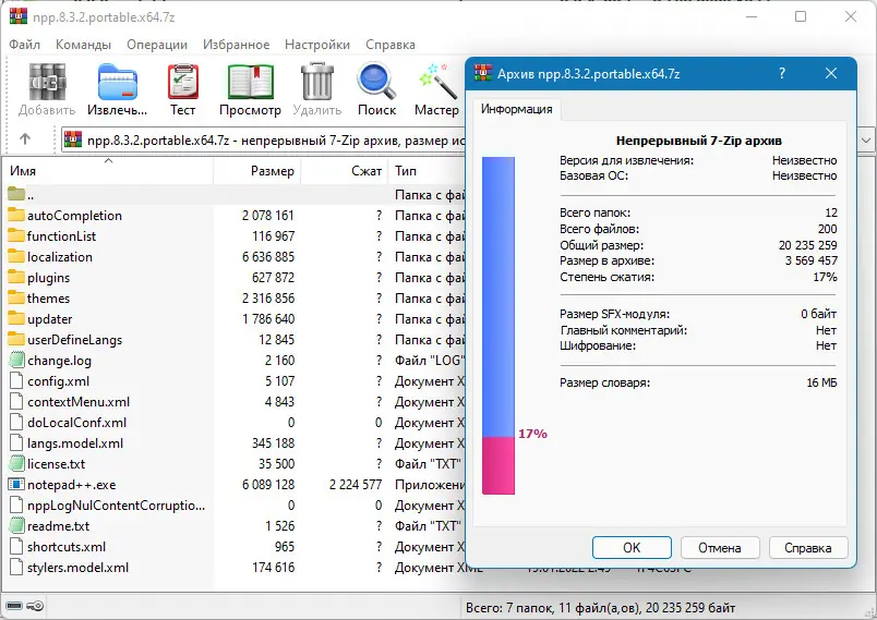 Notepad++ доступен для бесплатного скачивания в различных версиях, включая стандартную и портативную. Портативная сборка не требует установки и может использоваться на любом компьютере без изменения системных настроек. Файлы распространяются в сжатом архиве 7z с указанием контрольных сумм CRC32, MD5 и SHA-1 для проверки целостности. Поддержка русского языка встроена, интерфейс легко локализуется. Программа совместима с Windows 7, 8.1, 10 и 11 разрядностью 32 и 64 бит.