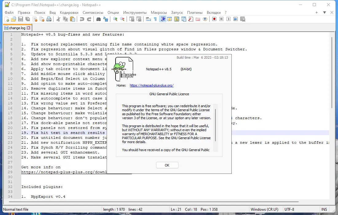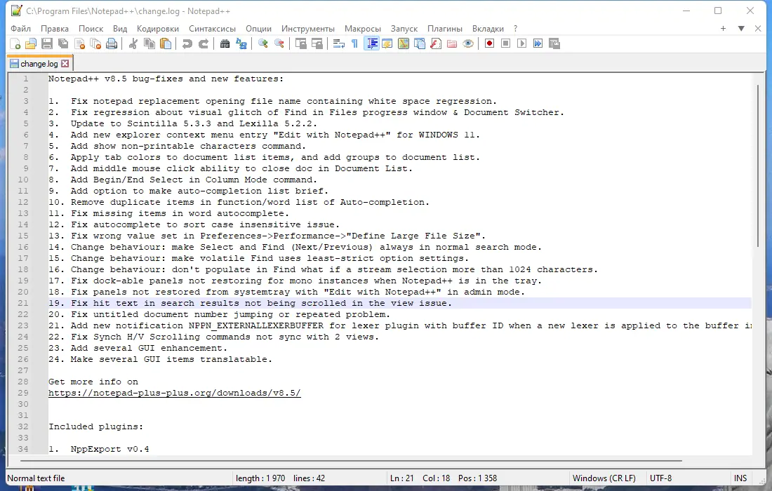 Программа доступна для загрузки в стандартной и портативной версиях, включая сборки для 32- и 64-битных систем. Обновление до версии 8.5 принесло исправление ошибок, улучшение интерфейса и новые функции, такие как отображение непечатаемых символов и цветовое выделение вкладок. Поддержка контекстного меню в Windows 11 и улучшенная работа с автозавершением делают редактор ещё удобнее. Интеграция с внешними плагинами и расширениями повышает универсальность использования. Программу можно скачать на странице.