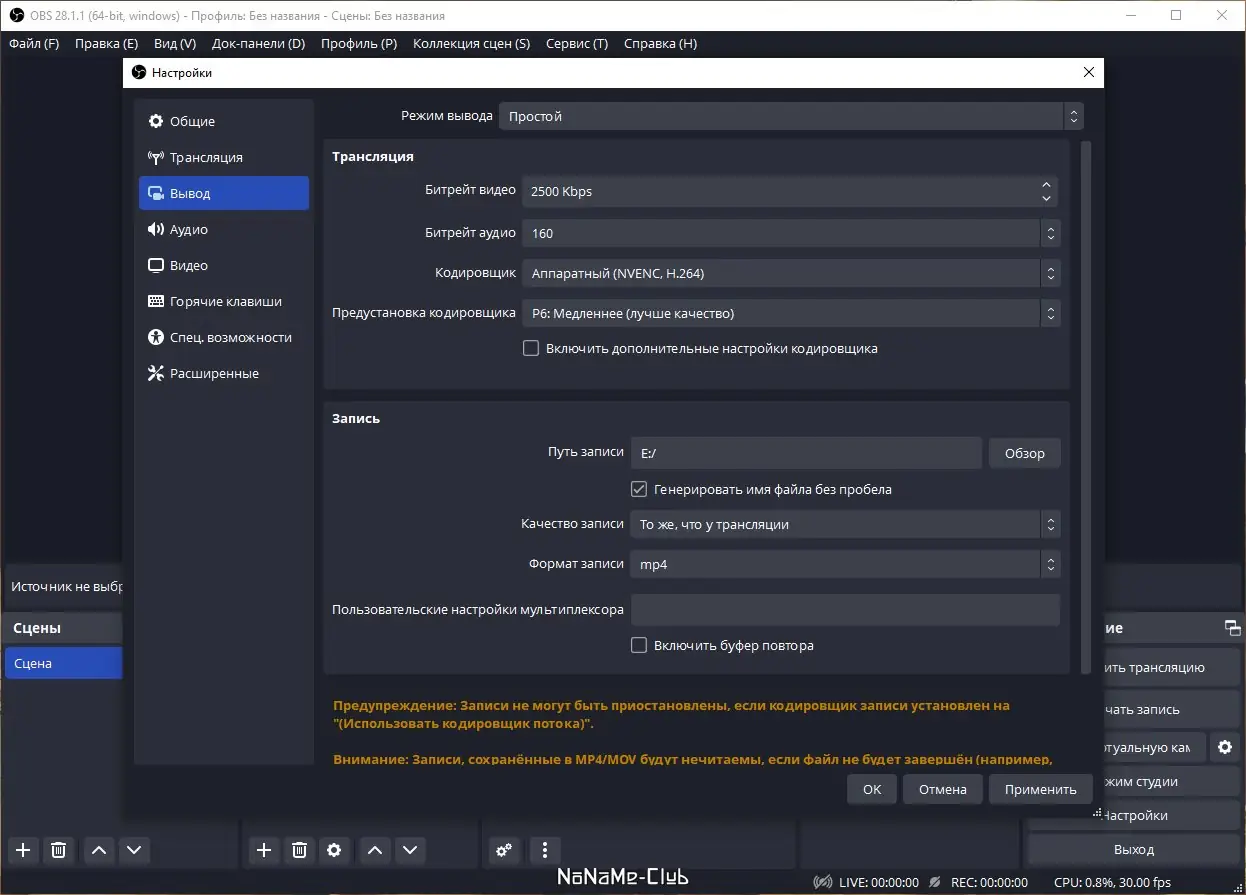 - Использование аппаратного ускорения через Intel Quick Sync Video и NVIDIA NVENC позволяет эффективно использовать ресурсы системы при стриминге.