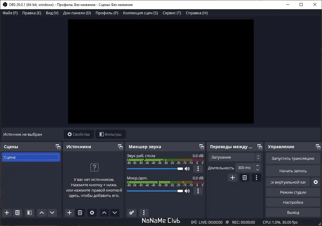 - Возможность создания множества сцен и добавления неограниченного числа источников.