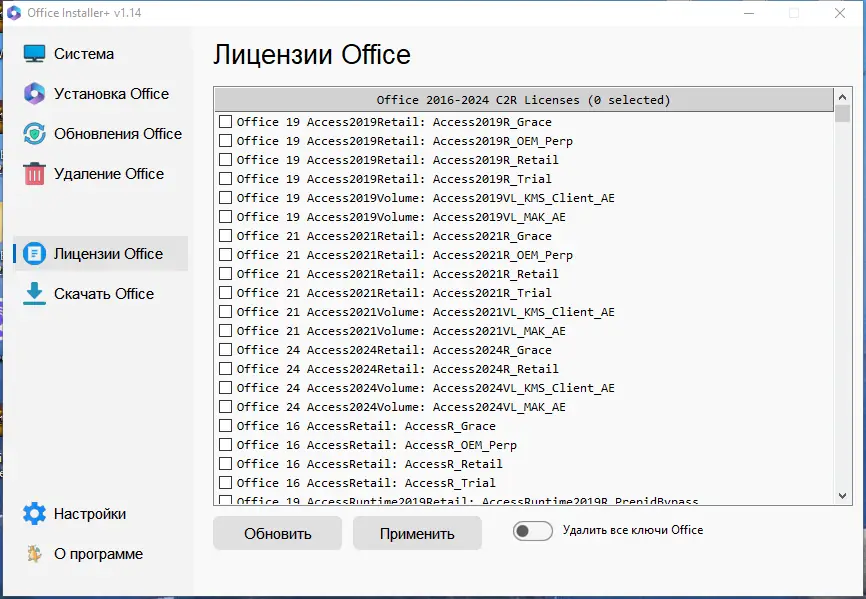 - Поддержка установки Microsoft Office 2016 и 2024 через C2R