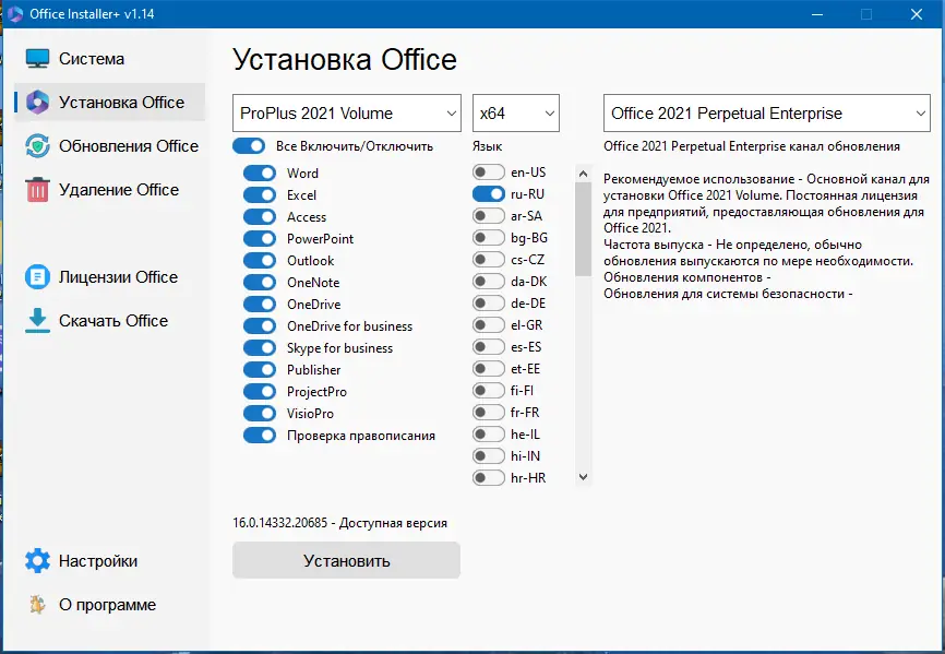 - Полная настройка разрядности, языка и редакции офиса