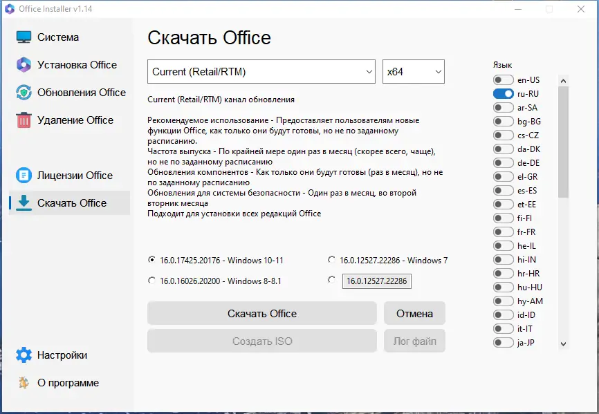 Office Installer — это утилита для установки Microsoft Office 2016 и 2024 через Click-to-Run в online и offline режимах. Программа позволяет создавать собственные дистрибутивы офисного пакета, включая полные x86-x64 версии, а также генерировать ISO-образы для последующего использования без подключения к интернету.