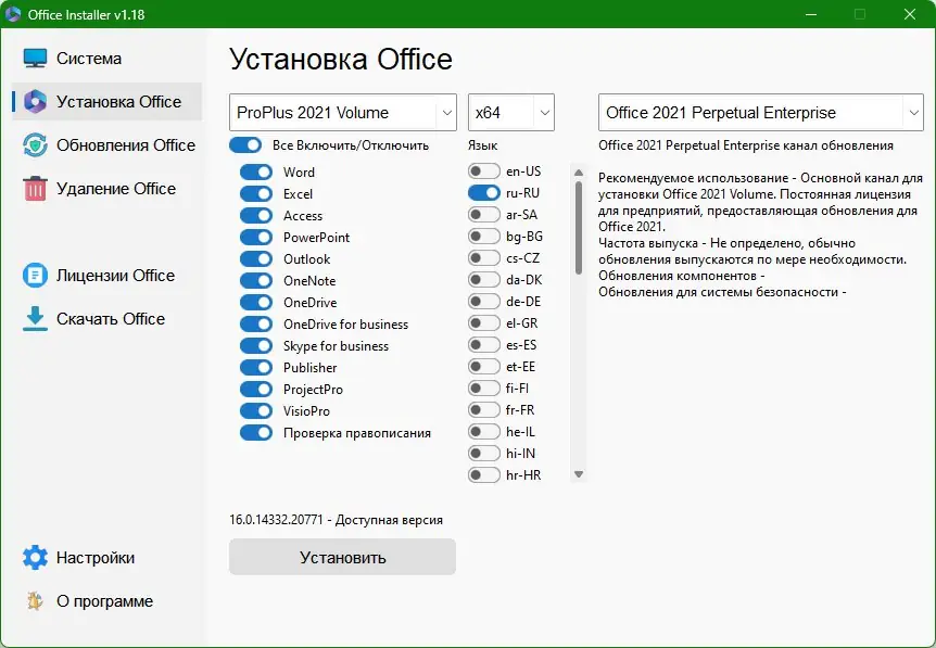 Программа предоставляет удобный интерфейс для управления установкой офисного пакета без необходимости ручного вмешательства в системные процессы. Она поддерживает как стандартные, так и расширенные сценарии установки, включая создание оффлайн-дистрибутивов и работу с лицензиями. Утилита совместима с различными редакциями Microsoft Office, включая ProPlus и Office 365, и позволяет избежать типичных ошибок, связанных с остатками предыдущих установок.
