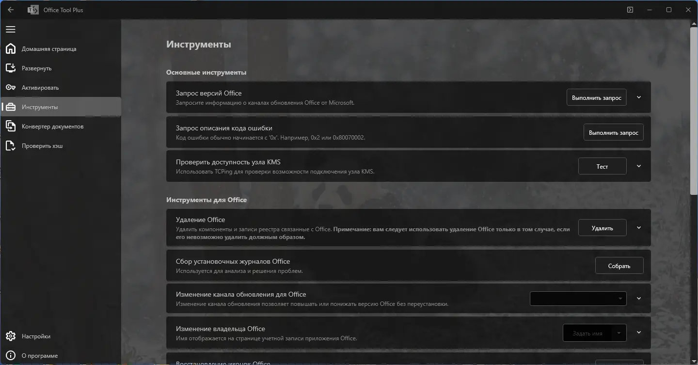 Office Tool Plus — это инструмент для тонкой настройки, установки и управления продуктами Microsoft Office. Программа позволяет загружать, изменять, удалять и активировать офисные пакеты без необходимости переустановки системы. Поддерживает широкий спектр версий, включая Microsoft 365, Office 2016–2021, Visio и Project.