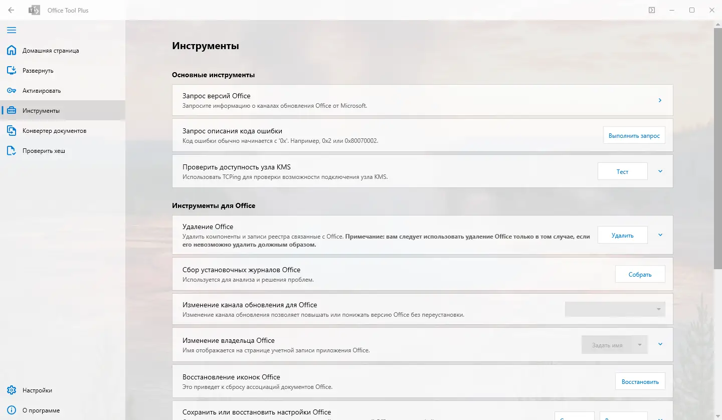 Office Tool Plus — это многофункциональное приложение для настройки, установки, изменения и управления продуктами Microsoft Office. С его помощью можно легко загрузить, настроить и активировать пакет Office, включая Microsoft 365, Office 2021, 2019, 2016, а также Visio и Project. Программа поддерживает различные каналы обновлений, языковые пакеты и позволяет создавать персонализированные конфигурации для быстрого развёртывания на нескольких устройствах.