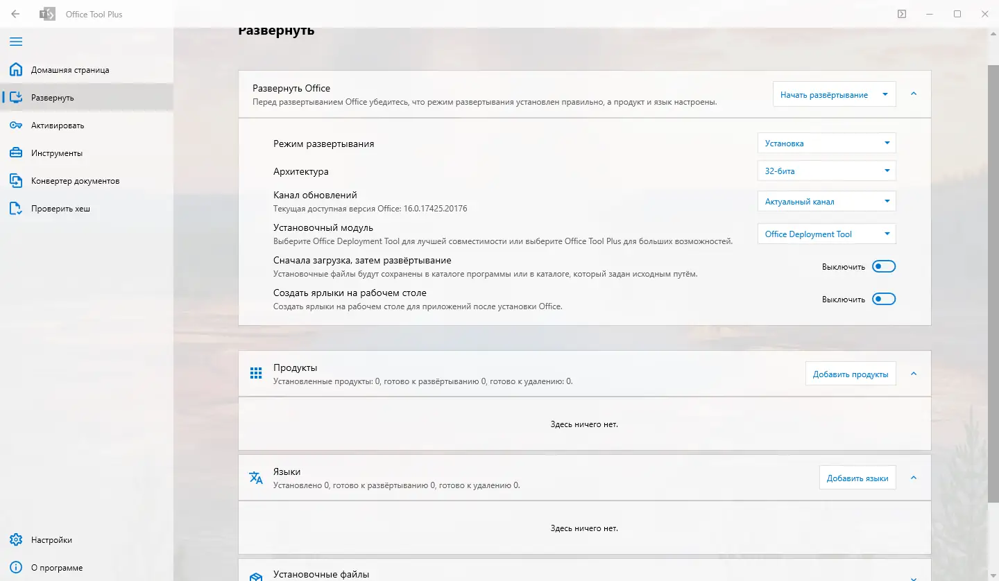 Office Tool Plus — это инструмент, разработанный для упрощения работы с офисными приложениями Microsoft. Он не является установщиком в привычном понимании, но предоставляет полный контроль над процессом развёртывания и настройки программного пакета. Пользователь может выбрать необходимые компоненты, язык интерфейса, версию продукта и даже подготовить конфигурацию в формате XML для последующего повторного использования. Программа поддерживает широкий спектр продуктов, включая Microsoft 365, Office 2016–2021, Project и Visio разных версий и планов подписки.