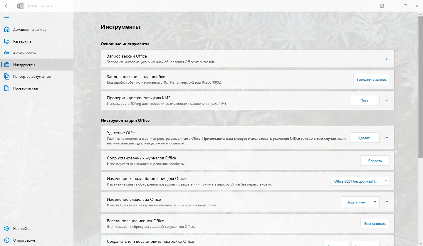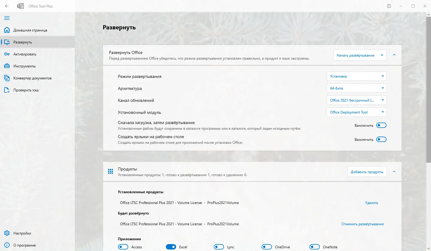 Office Tool Plus предоставляет расширенные возможности для работы с офисными приложениями Microsoft. С его помощью можно не только установить или удалить пакет Office, но и тонко настроить его состав, включая выбор языков, приложений и параметров обновления. Инструмент поддерживает широкий спектр продуктов, включая Microsoft 365, Office 2016–2021, Visio, Project и их облачные версии. Это делает его универсальным решением для автоматизации развёртывания офисного программного обеспечения.