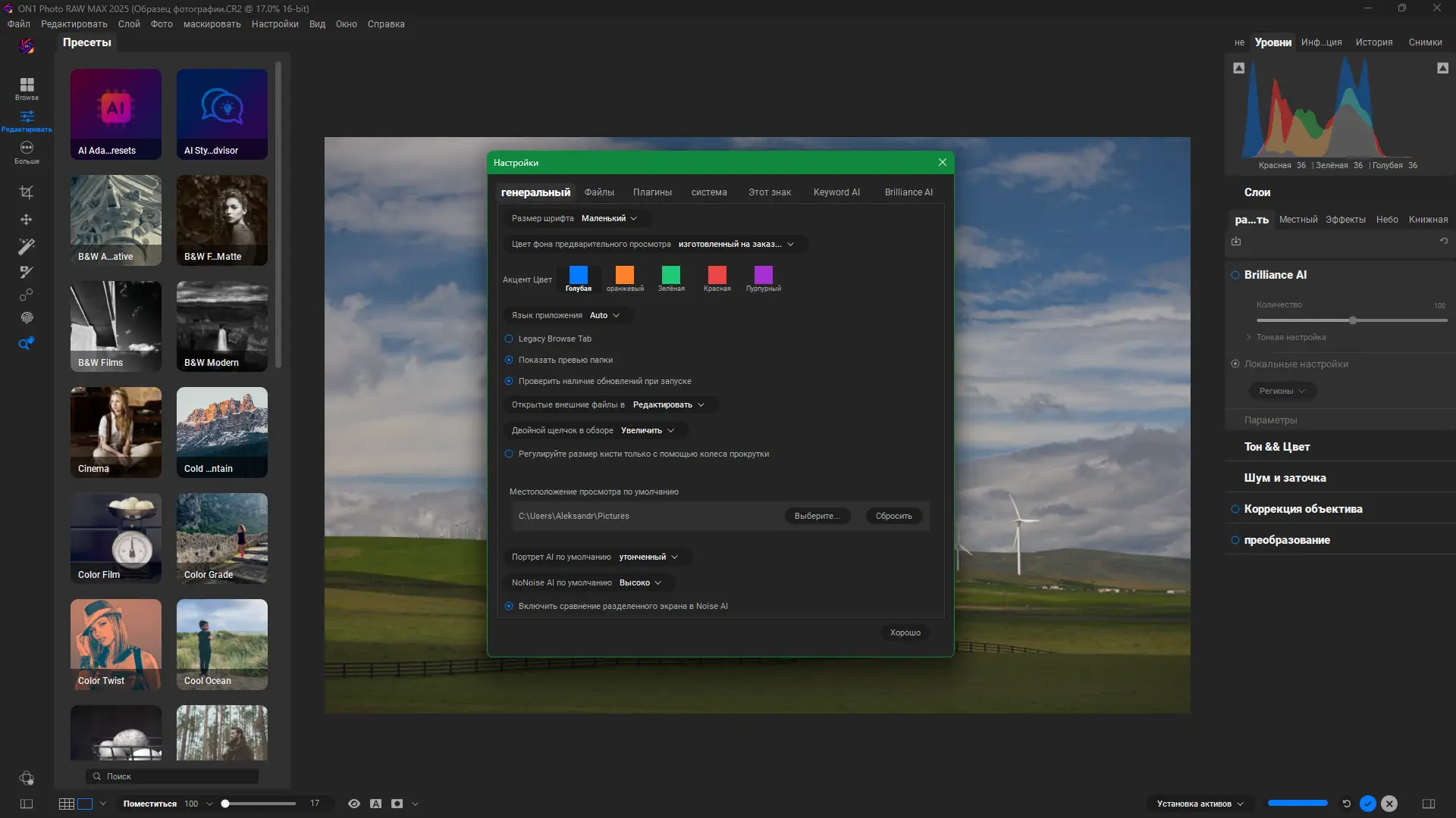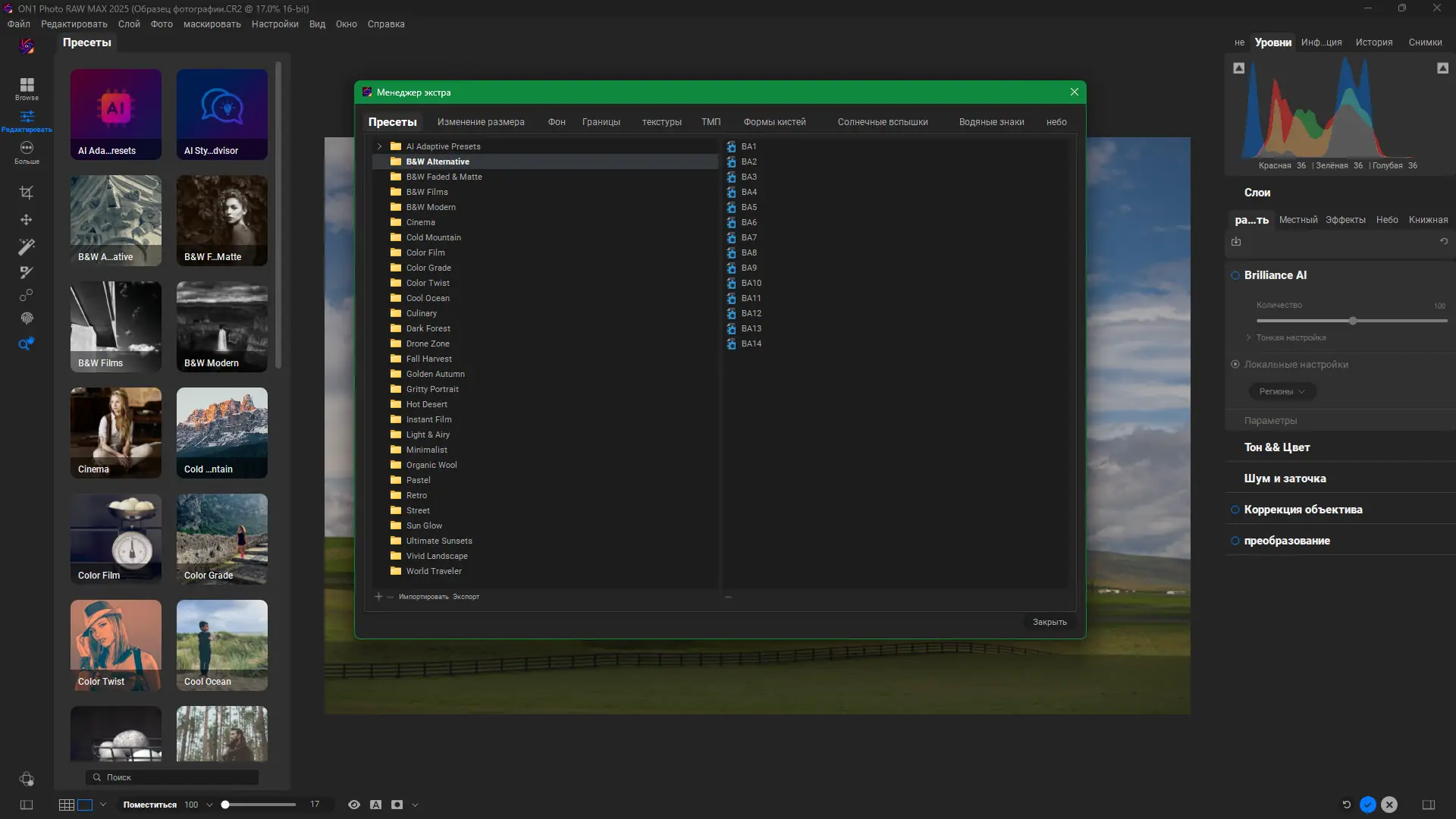 Благодаря технологии Brilliance AI, программа автоматически определяет ключевые области изображения и применяет локальные коррекции с высокой точностью.