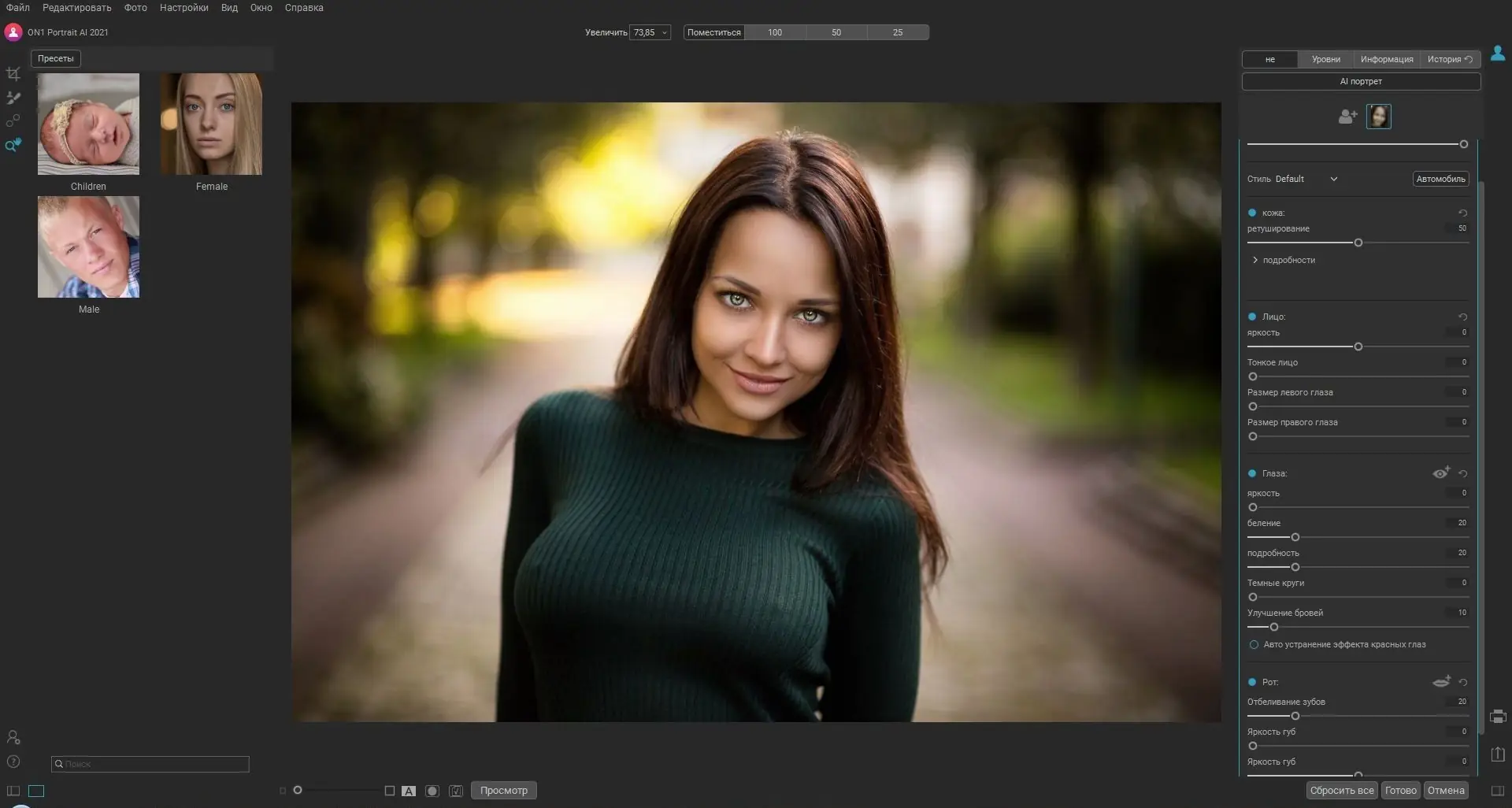 Работа с ON1 Portrait AI не требует сложной подготовки. После запуска приложение импортирует изображение и автоматически выделяет лица, применяя предустановленные профили коррекции. Пользователь может выбрать режим автоматической обработки или переключиться в ручной режим, где доступны инструменты для точечной ретуши. Настройки группируются по категориям — кожа, глаза, зубы, форма лица, — что упрощает навигацию и позволяет быстро вносить изменения.