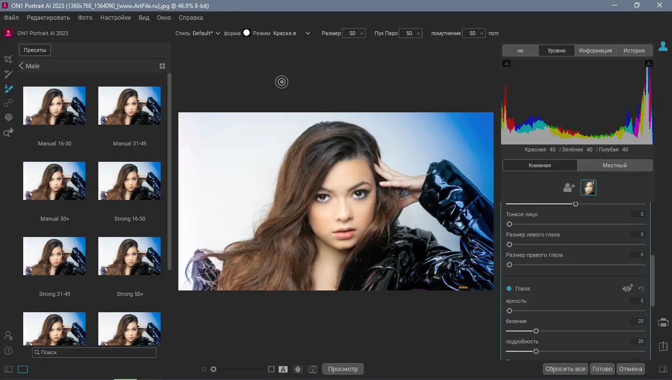 Для начала работы с программой достаточно загрузить изображение в интерфейс ON1 Portrait AI. Система автоматически выделит все лица, применив базовую коррекцию, которую можно регулировать с помощью ползунков. При необходимости доступны ручные инструменты: кисти для точечного редактирования, ластик с учётом содержимого, штамп клонирования и маски для локального воздействия. Пользователь может корректировать положение глаз, рта, форму подбородка и даже моделировать освещение, добавляя заполняющий свет для смягчения теней.
