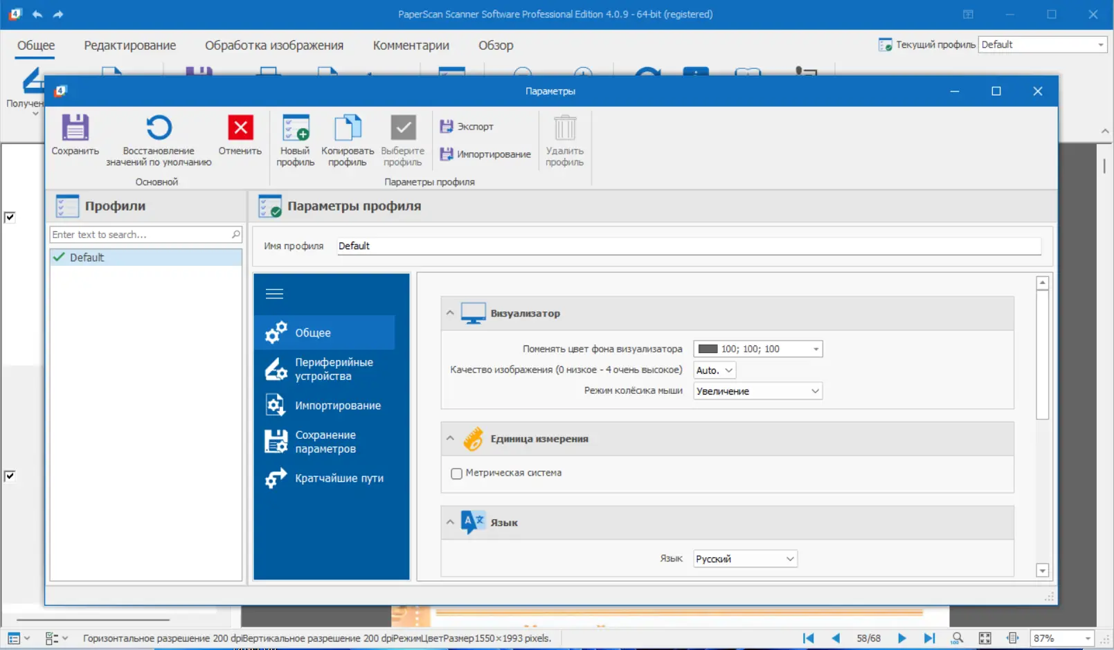 Интерфейс ORPALIS PaperScan интуитивно понятен и не требует глубоких технических знаний. После запуска приложения пользователь может сразу подключить сканер или импортировать файлы из папки. Далее доступны инструменты для обработки: коррекция цвета, поворот, обрезка и применение фильтров. Каждое действие можно выполнять как вручную, так и в автоматическом режиме. Настройки изображения включают регулировку яркости, контрастности, гаммы и насыщенности, что особенно полезно при работе с изношенными или плохо отсканированными документами. Поддержка форматов TIFF, JPEG, PNG, PDF/A и JBIG2 позволяет выбрать оптимальный баланс между качеством и размером файла. Для ускорения рутинных задач реализована функция сохранения профилей, которые можно применять к последующим заданиям.