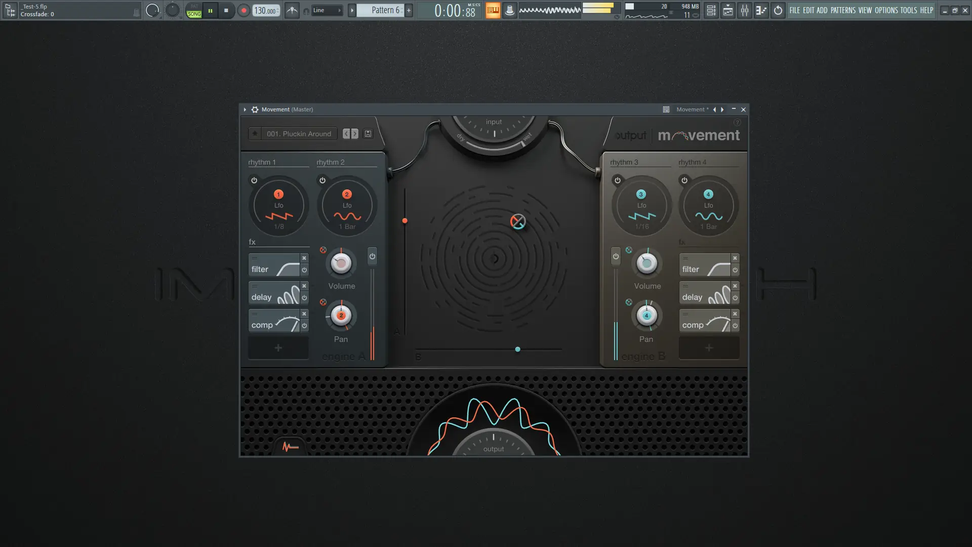 - Movement добавляет динамические ритмические эффекты к любому входящему аудиосигналу.