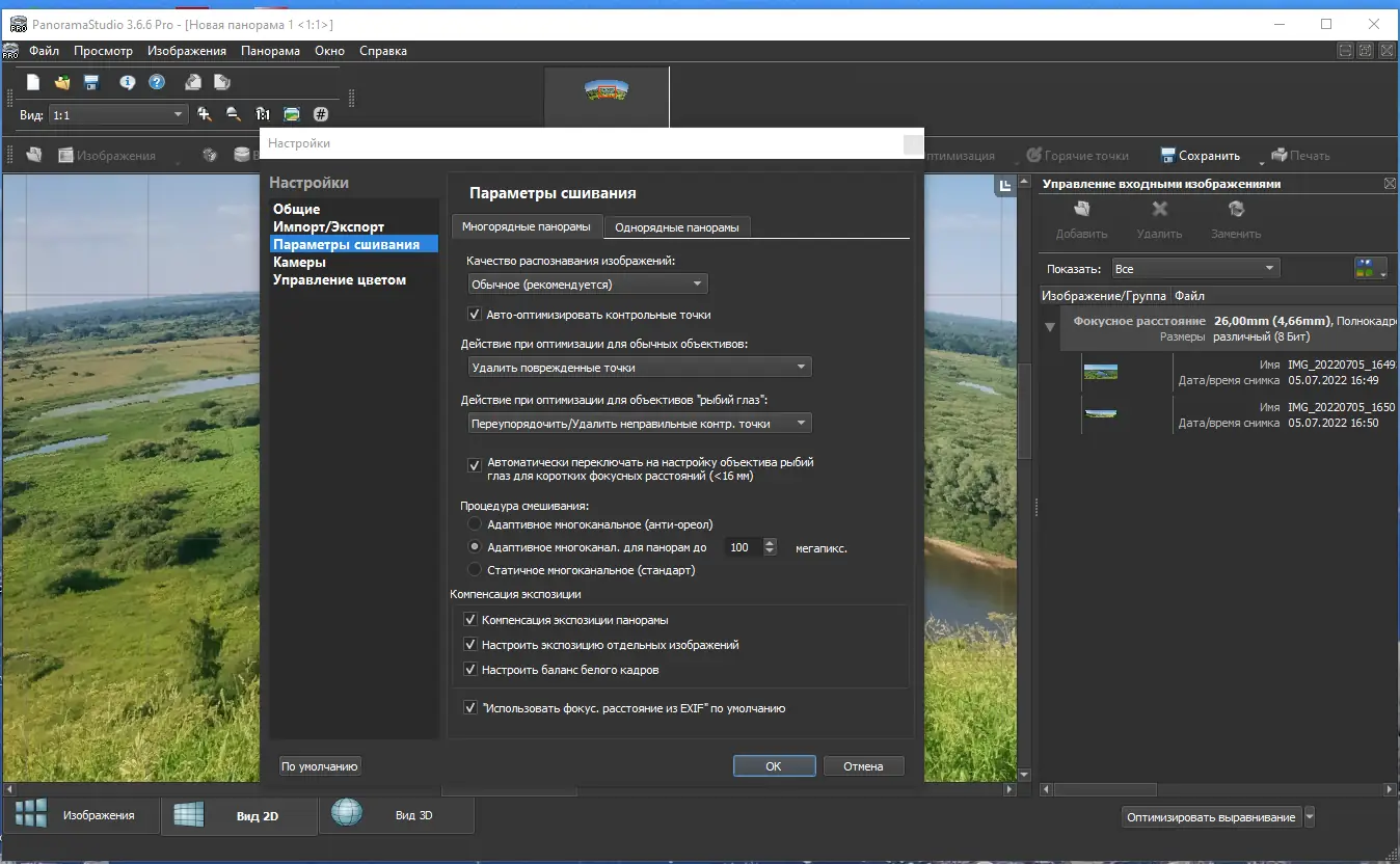 - Программа автоматически определяет фокусное расстояние и исправляет искажения объектива, что особенно полезно при работе с широкоугольными снимками.