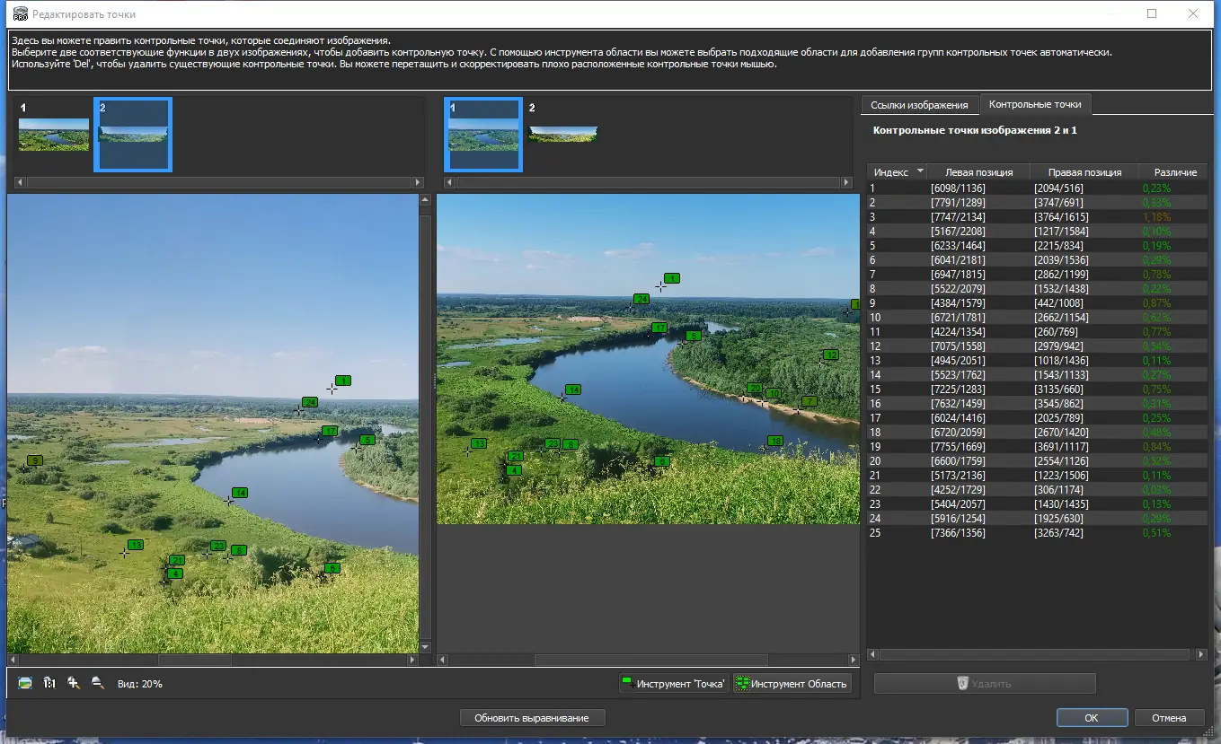 - Редактор контрольных точек даёт возможность вручную корректировать совмещение кадров для достижения идеального результата.