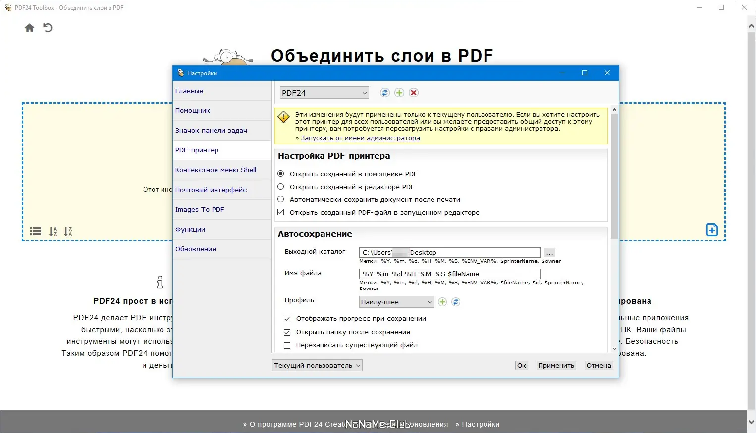 PDF24 — мощный инструмент для создания, редактирования и конвертации PDF-документов с поддержкой виртуального принтера и множества вспомогательных функций. Программа работает с изображениями и документами, обеспечивая простоту в использовании и высокую функциональность. Можно скачать бесплатно русская версия для Windows с полной локализацией интерфейса.