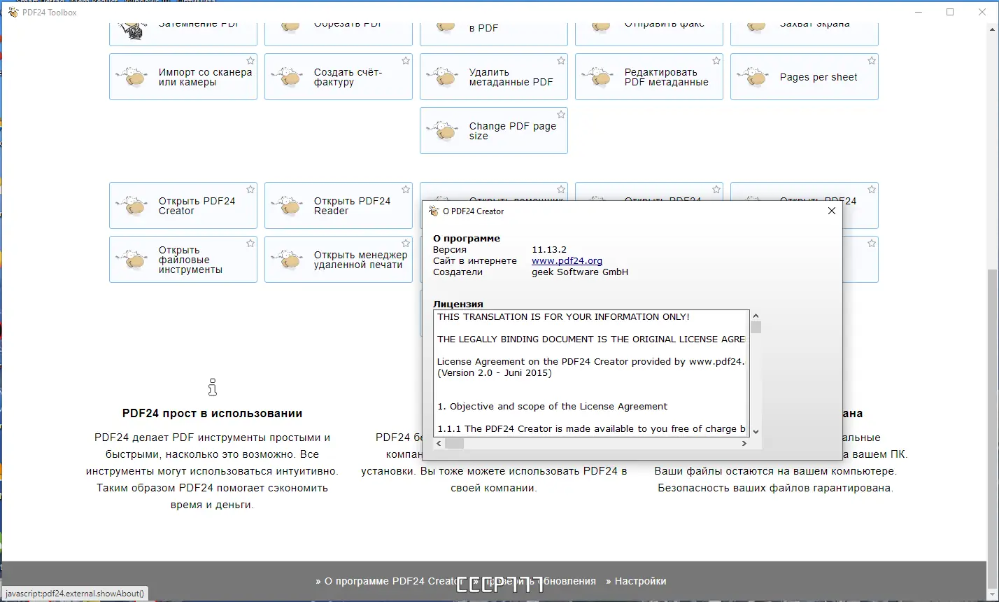 PDF24 Creator — это бесплатный инструмент для создания, редактирования и конвертации PDF-документов, работающий через виртуальный принтер. Программа поддерживает широкий спектр функций: от объединения и разделения файлов до защиты паролем и создания подписей. Утилита проста в использовании и не требует специальных навыков, что делает её подходящей как для домашнего, так и для офисного применения.