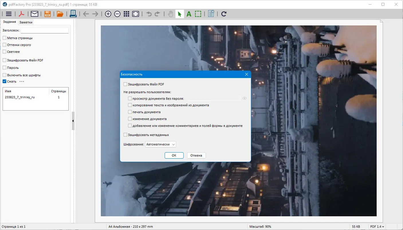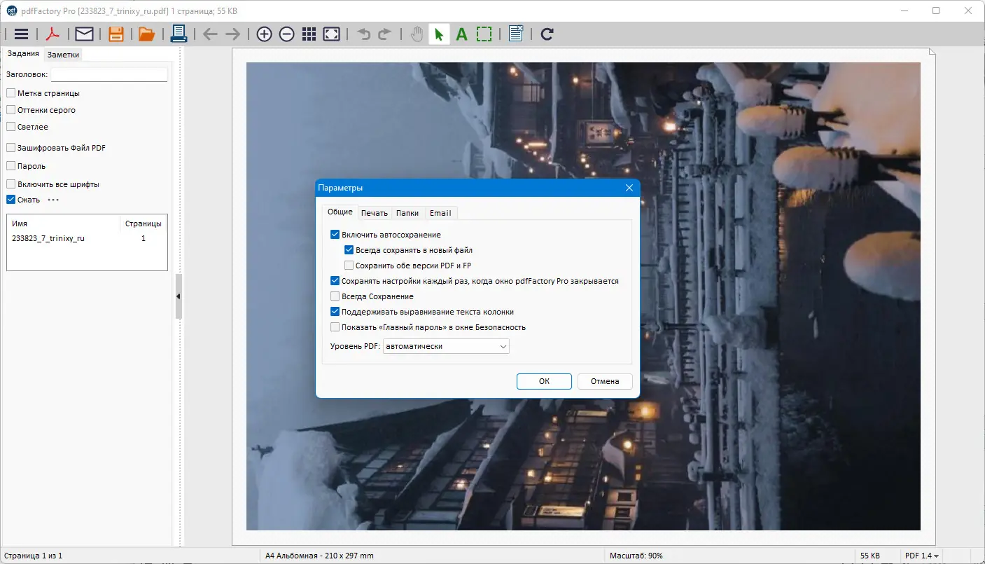 PdfFactory сочетает в себе простоту использования и широкие возможности для форматирования и защиты документов. Особенно выделяется версия pro, которая добавляет профессиональные функции, недоступные в базовой сборке. Программа поддерживает создание PDF/A для архивирования, преобразование в оттенки серого, обрезку страниц и автоматическое формирование оглавления. Работа с закладками, водяными знаками и подписями делает её подходящей для деловой переписки и юридических документов. Однако отсутствие полноценного редактора текста внутри PDF ограничивает возможности постобработки.