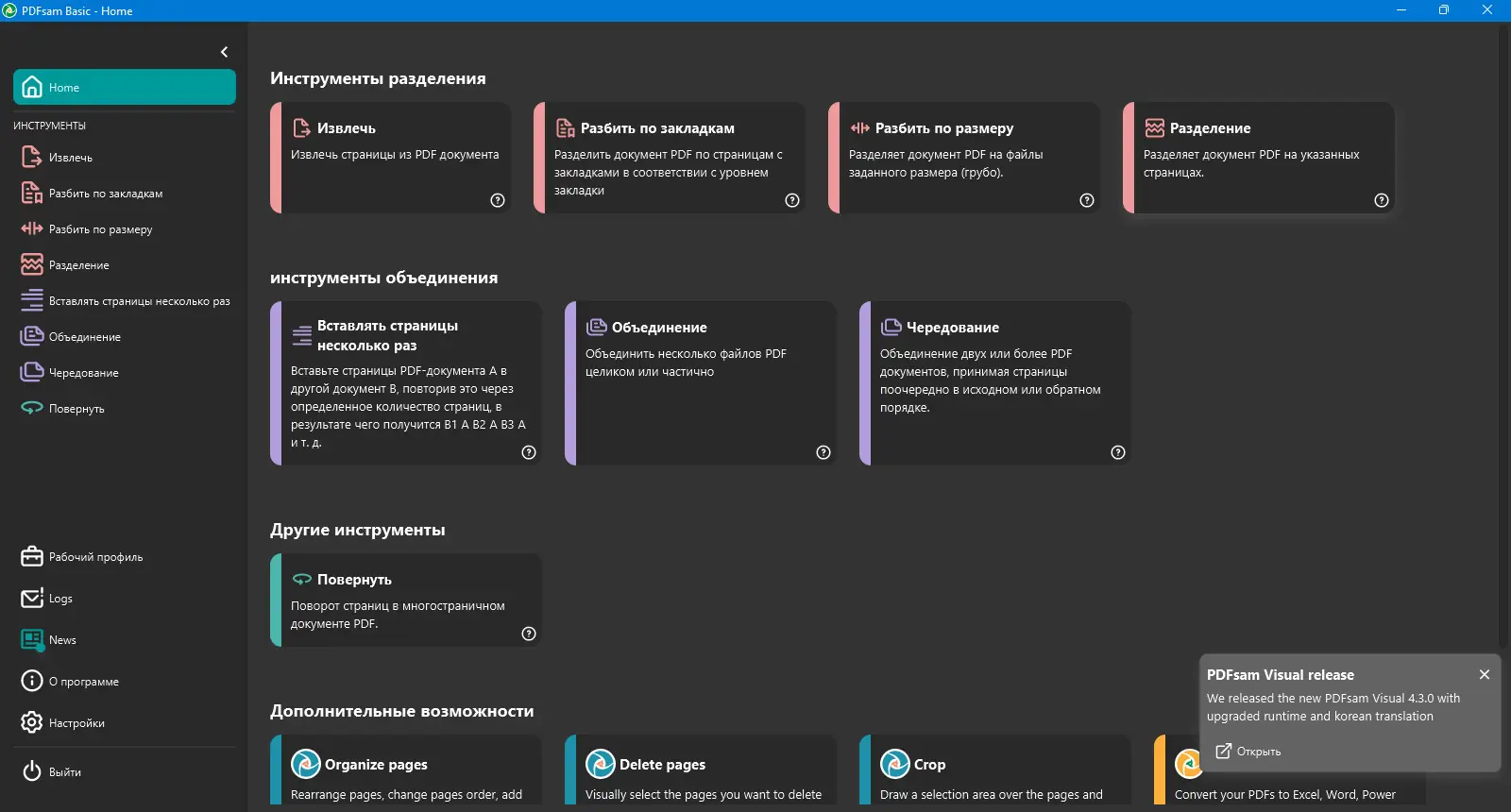 PDFsam — это удобный инструмент для работы с PDF-документами, позволяющий разделять, объединять, поворачивать и изменять порядок страниц. Программа подходит как для домашнего, так и для профессионального использования, обеспечивая простоту и надёжность при обработке файлов.