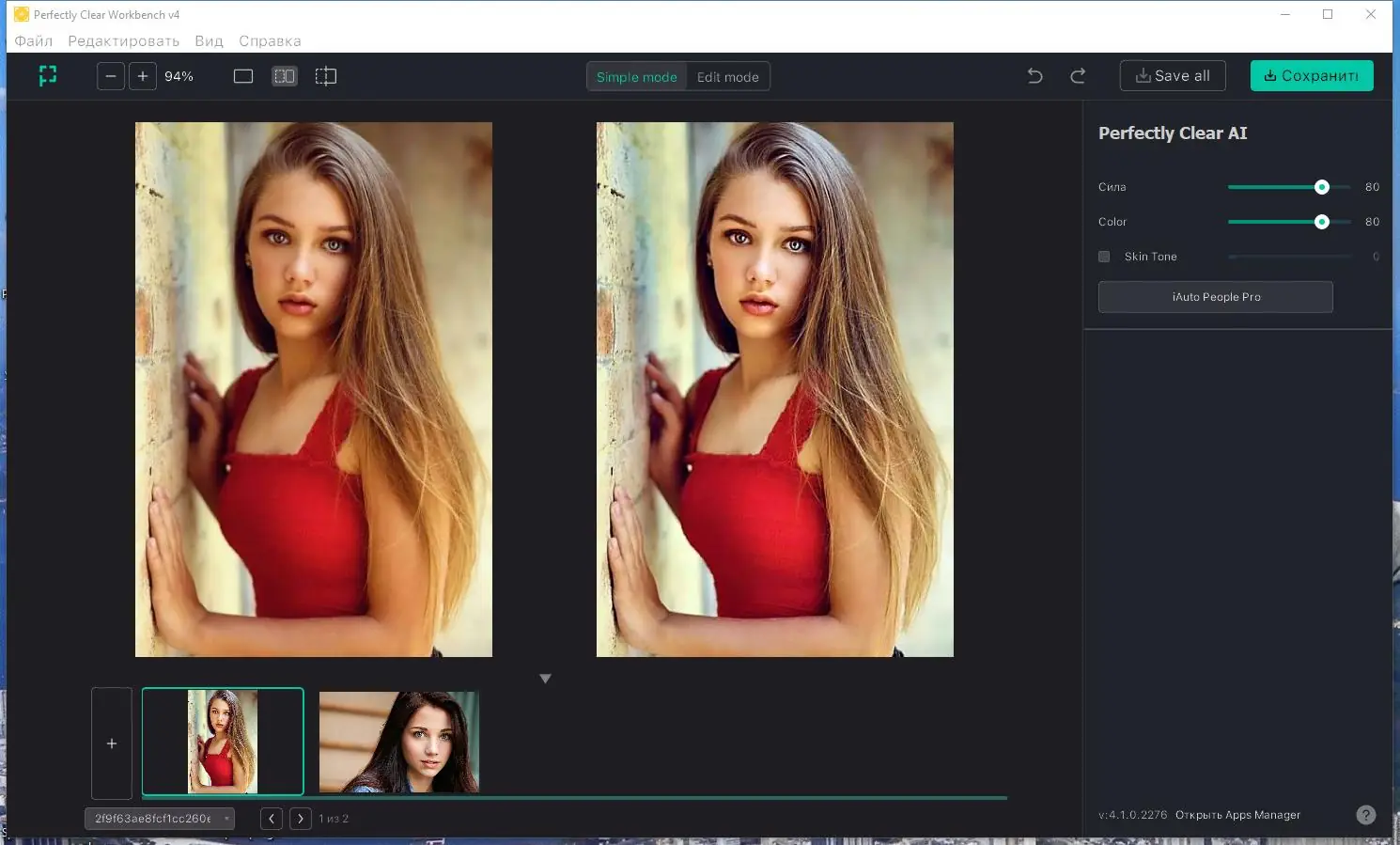 - Автоматическая коррекция учитывает более десятка параметров, включая тон кожи, экспозицию, шумы и цветовой баланс, что обеспечивает естественный результат.