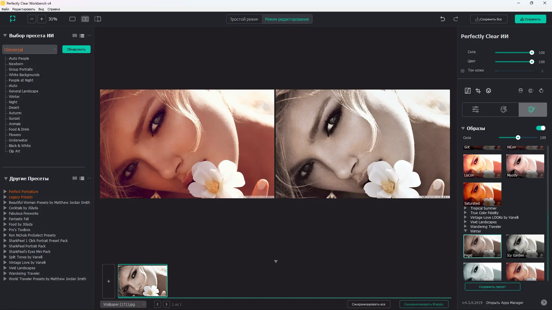 Perfectly Clear WorkBench — это мощный инструмент для автоматической и ручной коррекции изображений, разработанный для фотографов и дизайнеров, стремящихся к идеальному качеству снимков. Программа устраняет дефекты, вызванные ограничениями цифровых камер, включая шумы, засветку, размытость и неестественный тон кожи. Поддержка слоёв, точечное редактирование и продвинутые алгоритмы делают обработку фото быстрой и эффективной.