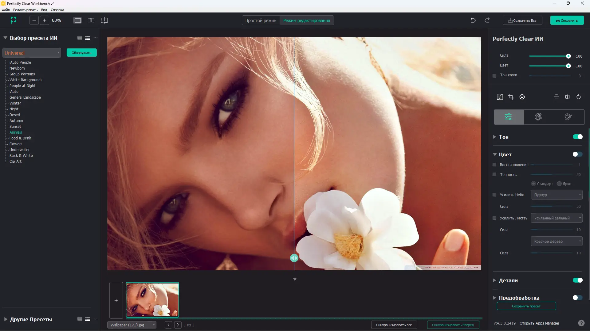 Работа с программой начинается с загрузки изображения в интерфейс WorkBench. Пользователь может выбрать автоматический режим, в котором все корректировки применяются мгновенно, или перейти в ручной режим для тонкой настройки параметров. Доступна работа с выделенными областями, что позволяет, например, улучшить только лицо на портрете, не затрагивая фон. Смарт-резкость, подавление шума и коррекция динамического диапазона настраиваются ползунками, а предустановленные пресеты ускоряют процесс обработки. Программа также совместима с удалённым доступом, что удобно для профессионалов, работающих в распределённых командах.