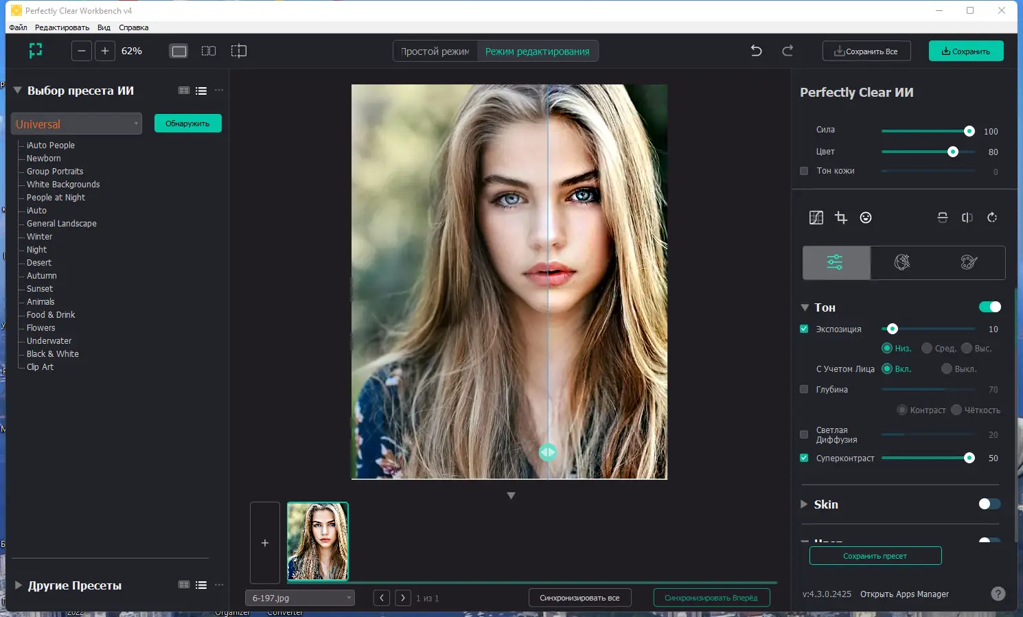 Perfectly Clear WorkBench — это мощный инструмент для автоматической и ручной коррекции цифровых фотографий, устраняющий дефекты съёмки и восстанавливающий естественную выразительность изображений. Программа использует запатентованные технологии обработки, основанные на многолетних исследованиях, и подходит как для новичков, так и для профессиональных фотографов.